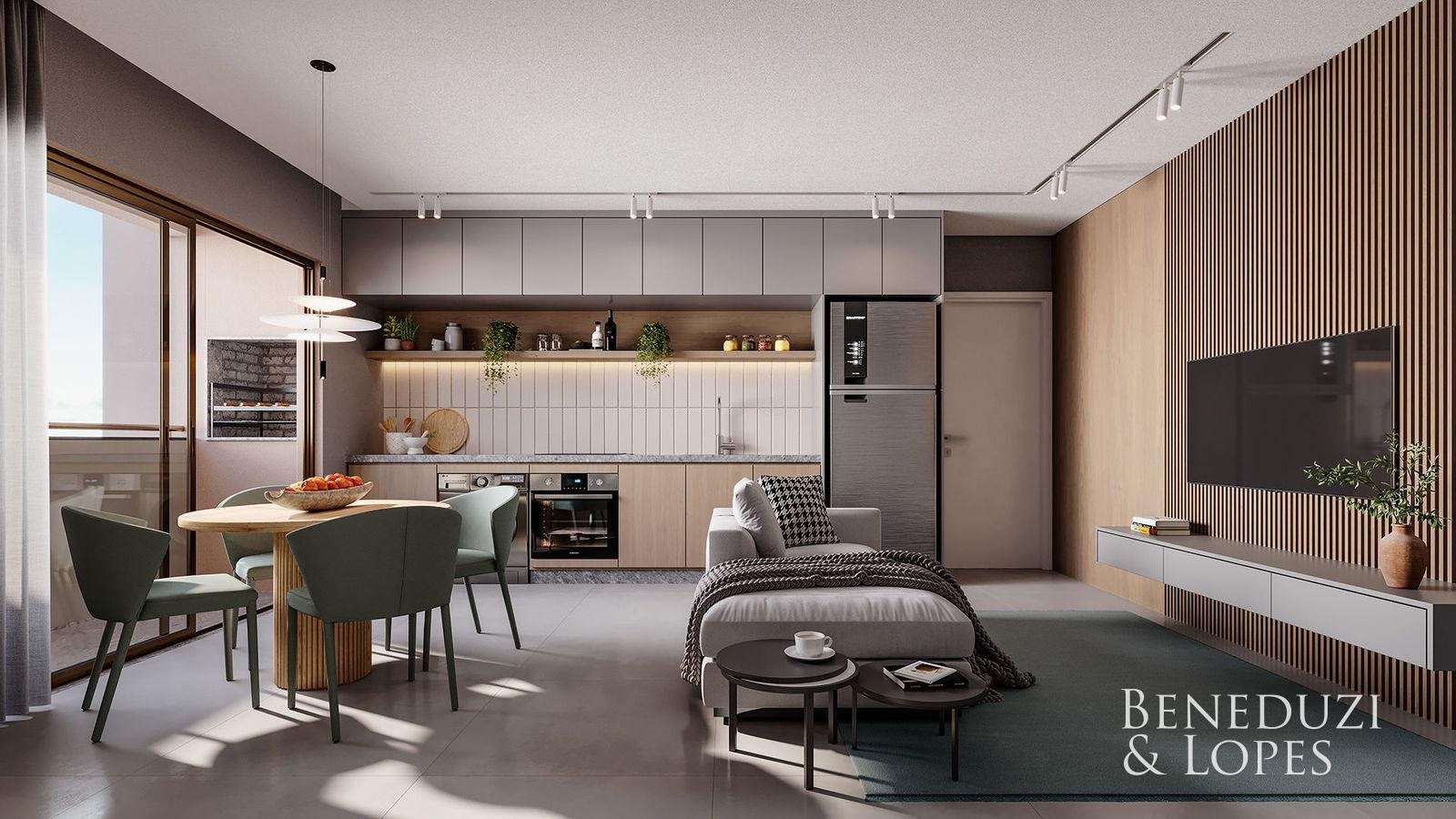 Apartamento com living integrado e sala de jantar, oferecendo ambientes…