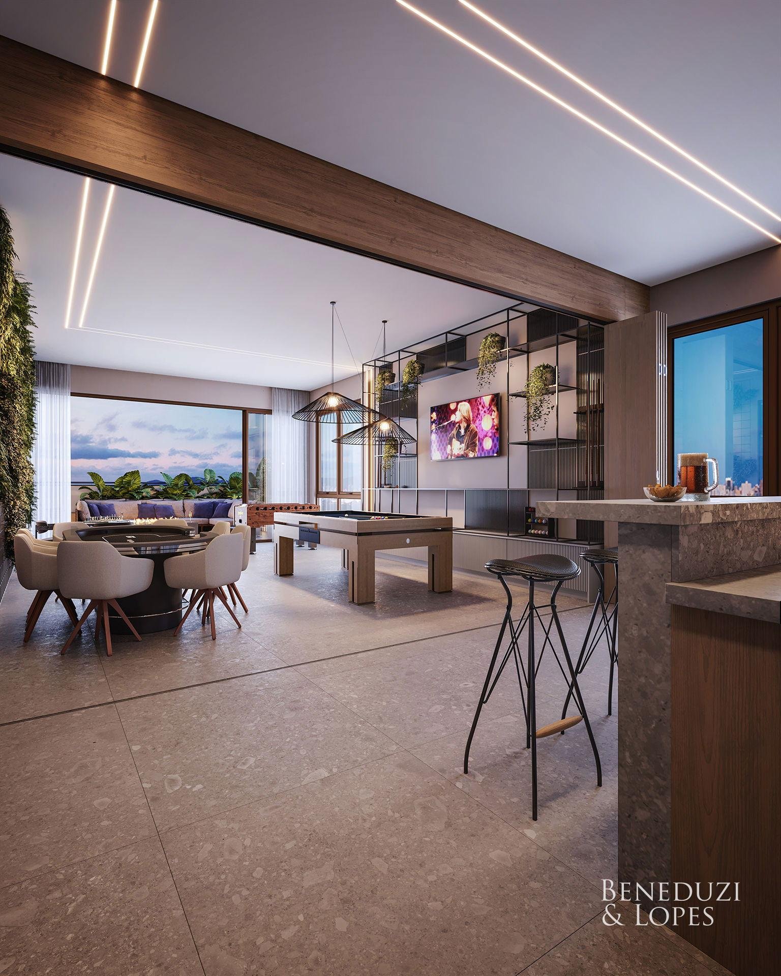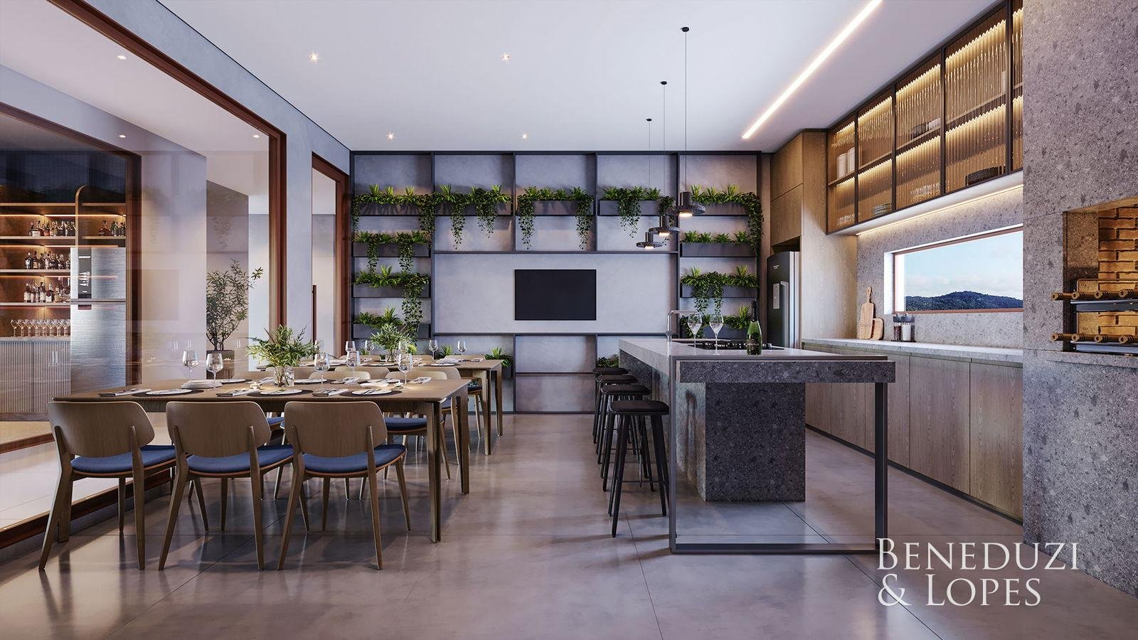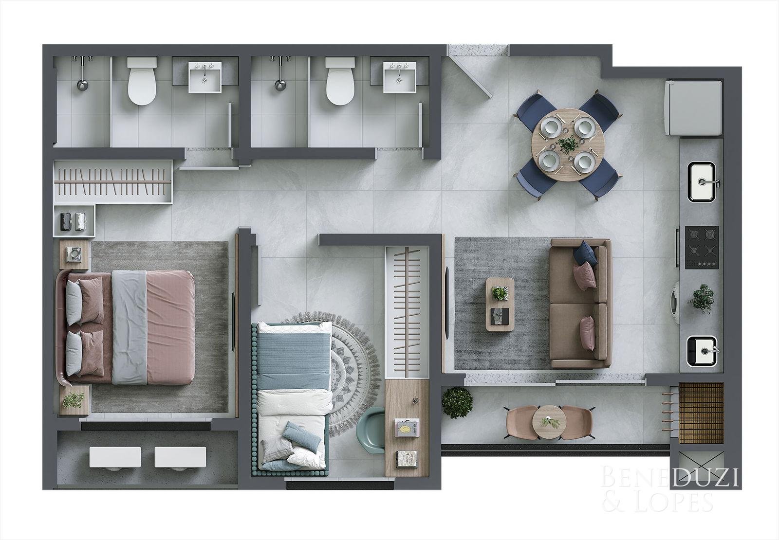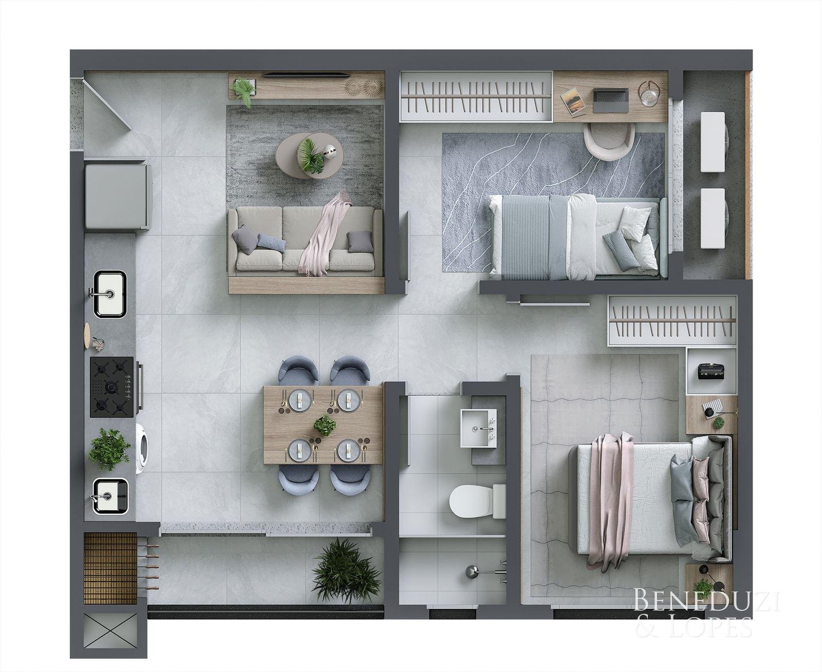 Apartamento com living integrado, sala de estar e cozinha, proporcionando ambientes funcionais e bem distribuídos. Conta com área de serviço, sacada integrada com churrasqueira e banheiro social, ideal para o dia a dia com conforto e praticidade.