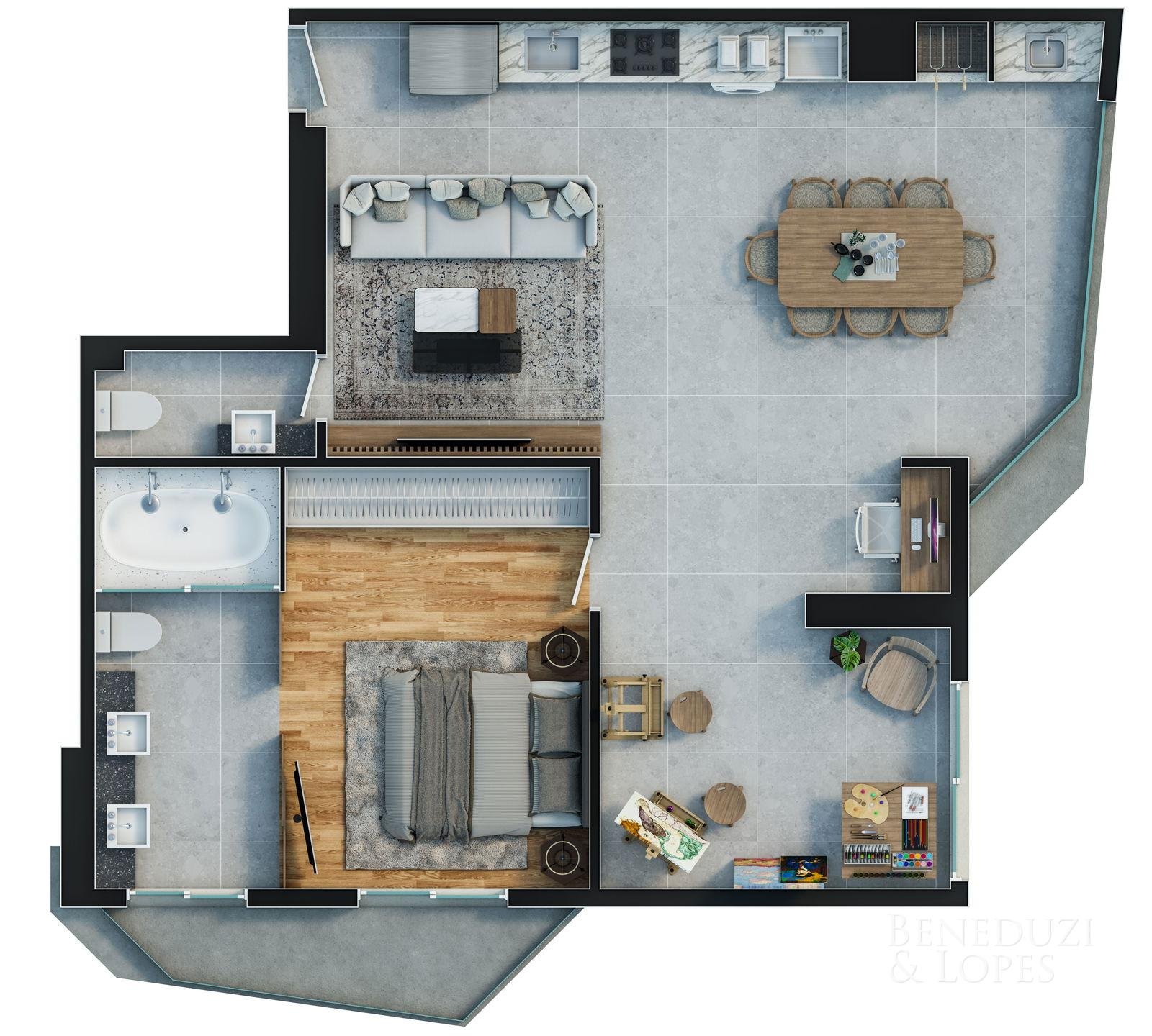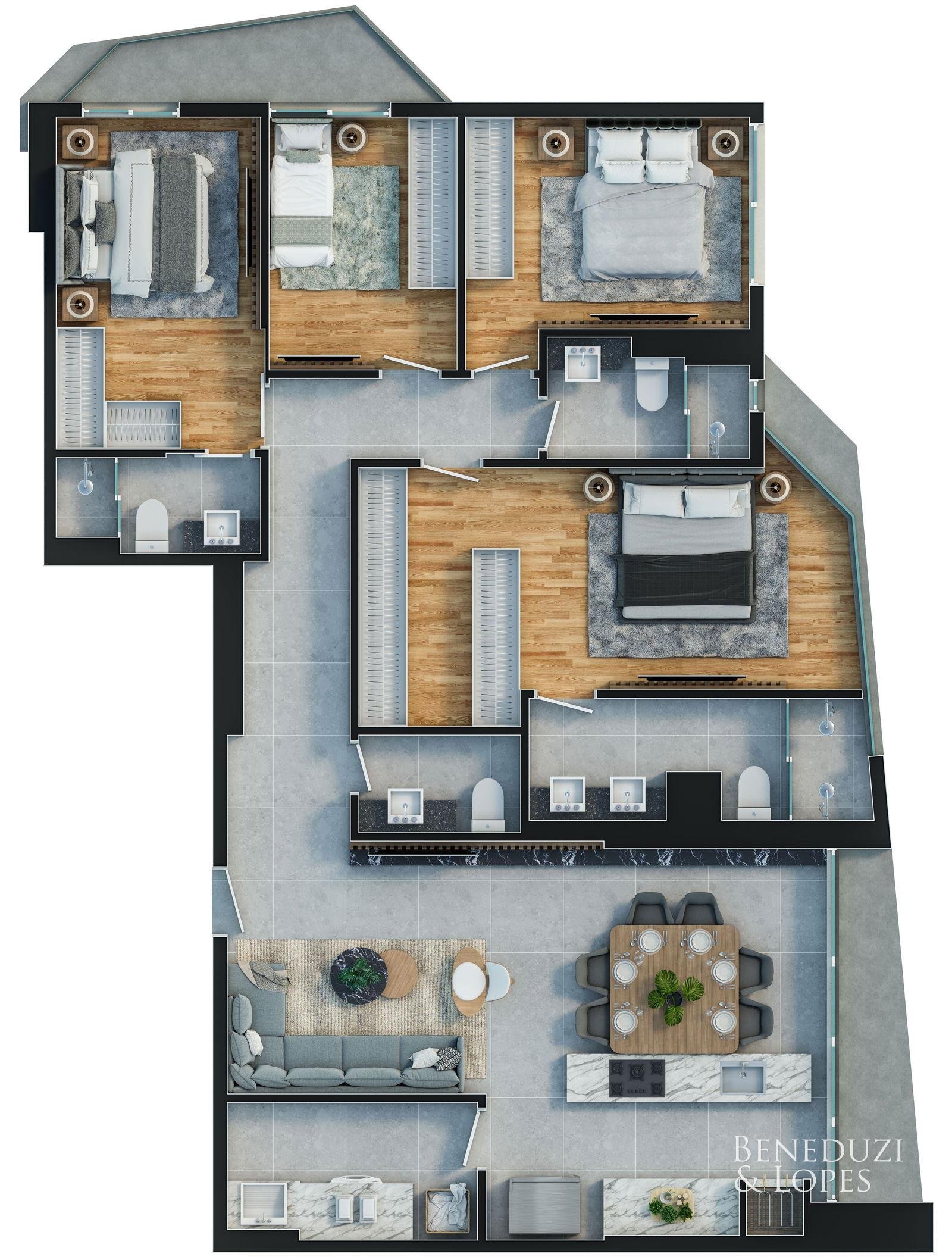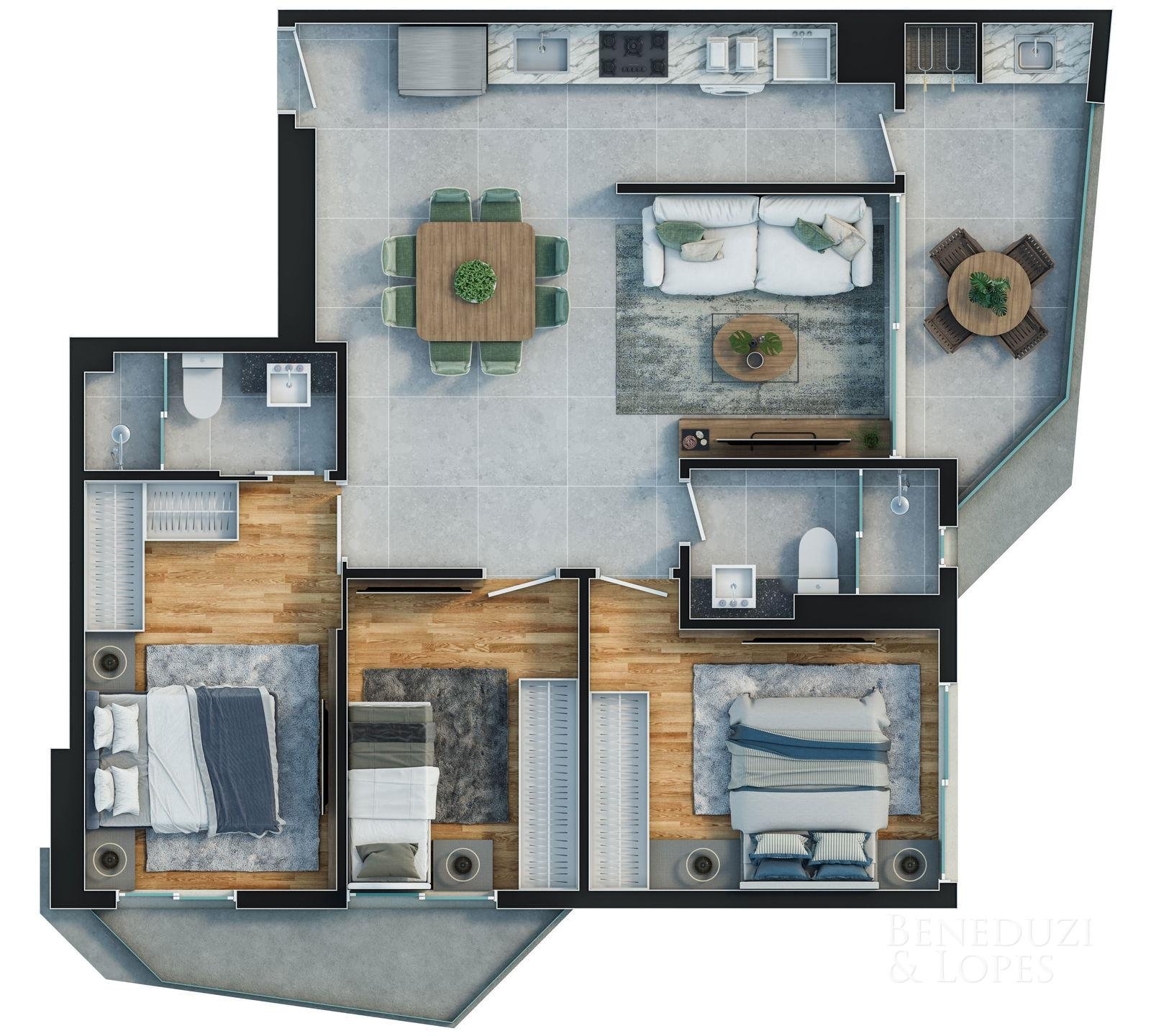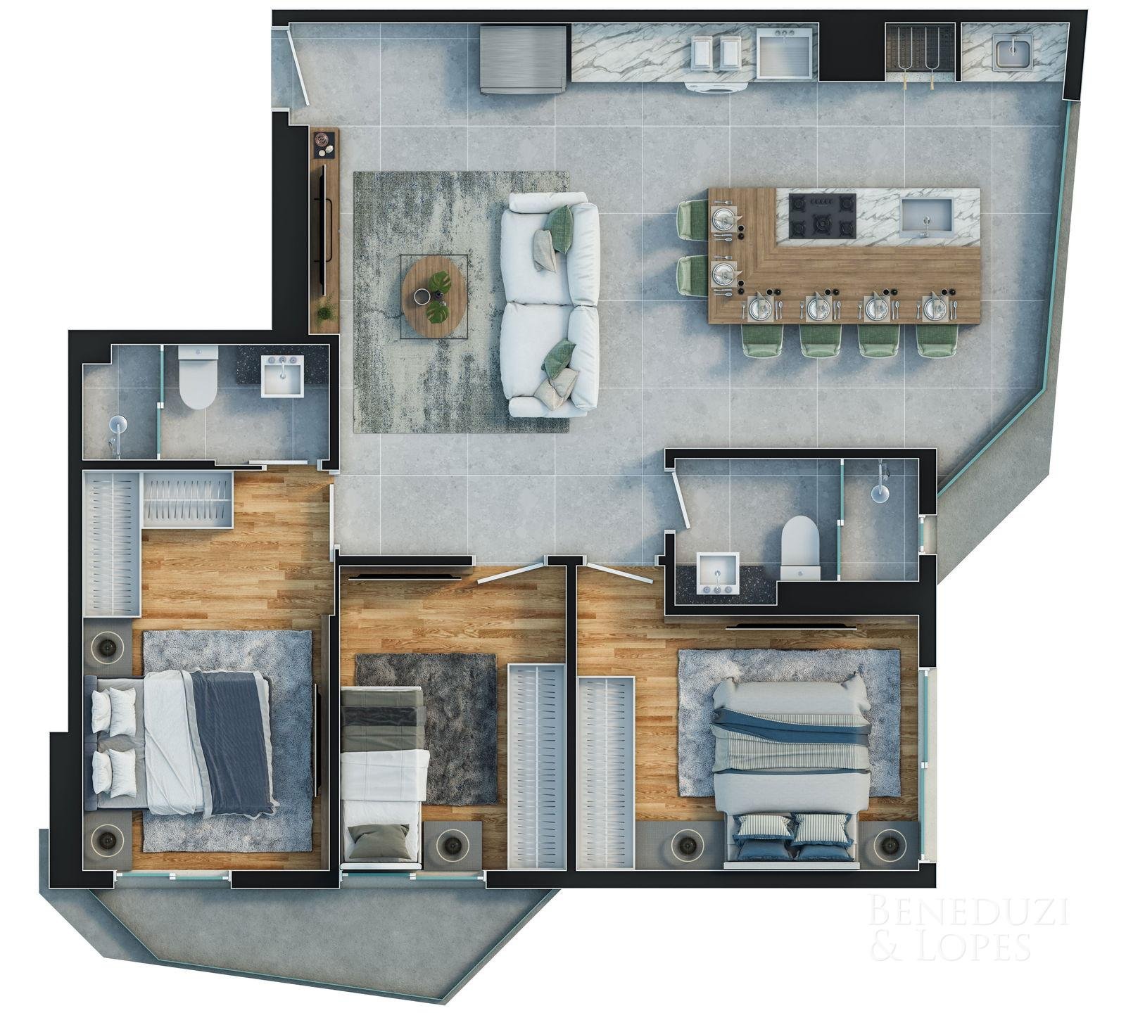 Apartamento com plantas flexíveis, com opções de 1, 2, 3 e 4 dormitórios, atendendo diferentes perfis de moradia e investimento.