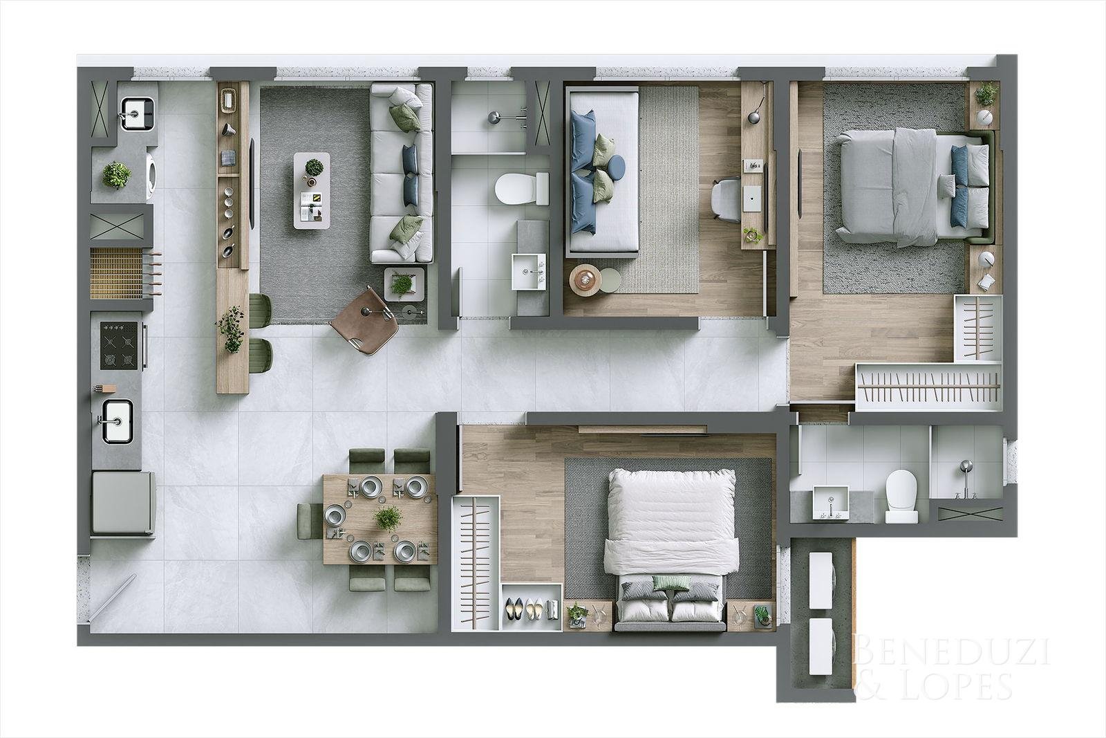 Apartamento com 02 ou 03 dormitórios (sendo 01 suíte), oferecendo ambientes bem distribuídos e funcionais. Conta com living integrado, sala de estar e sala de jantar, além de sacada com churrasqueira a carvão e banheiro social, ideal para o dia a dia com conforto e praticidade.