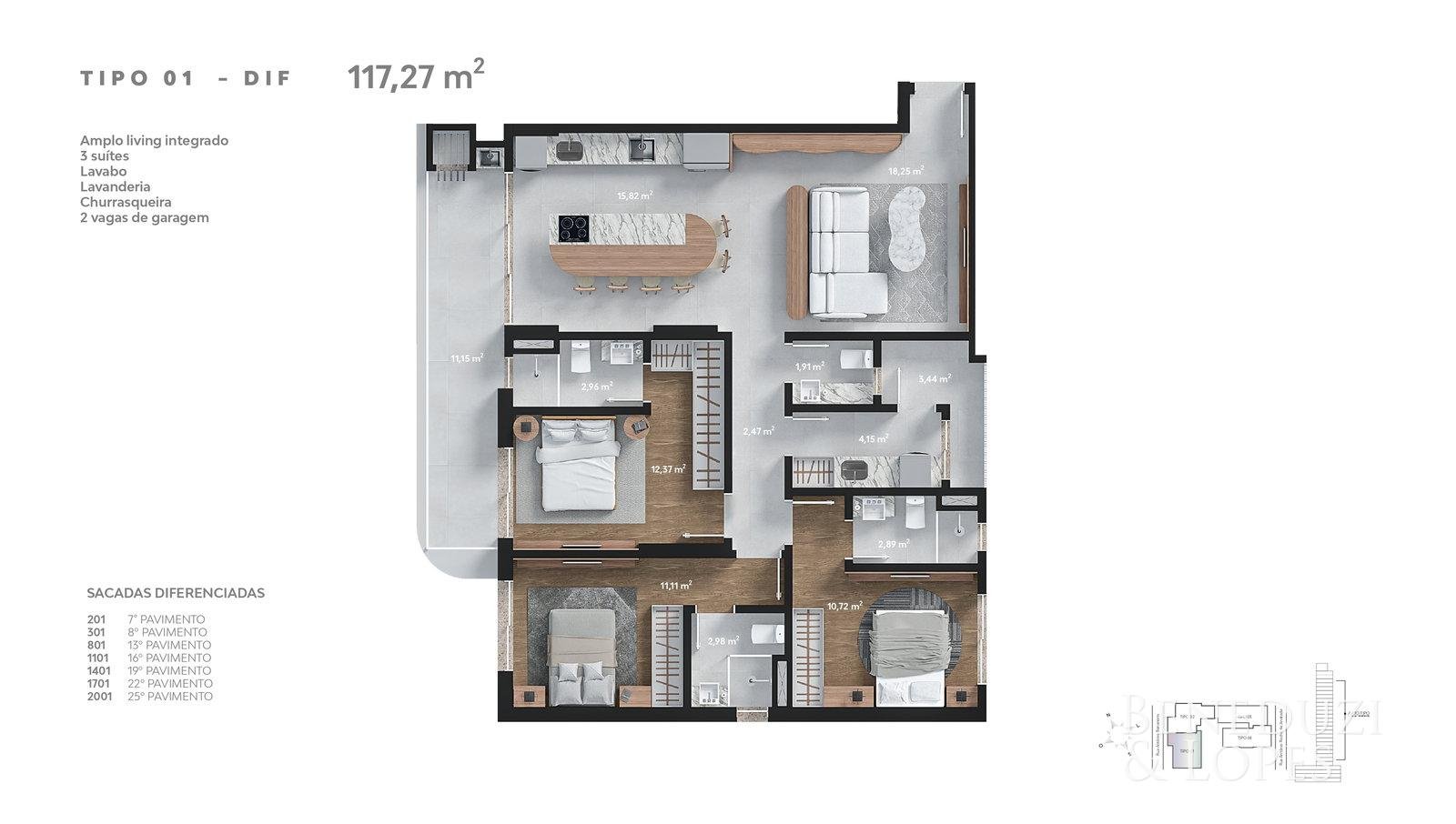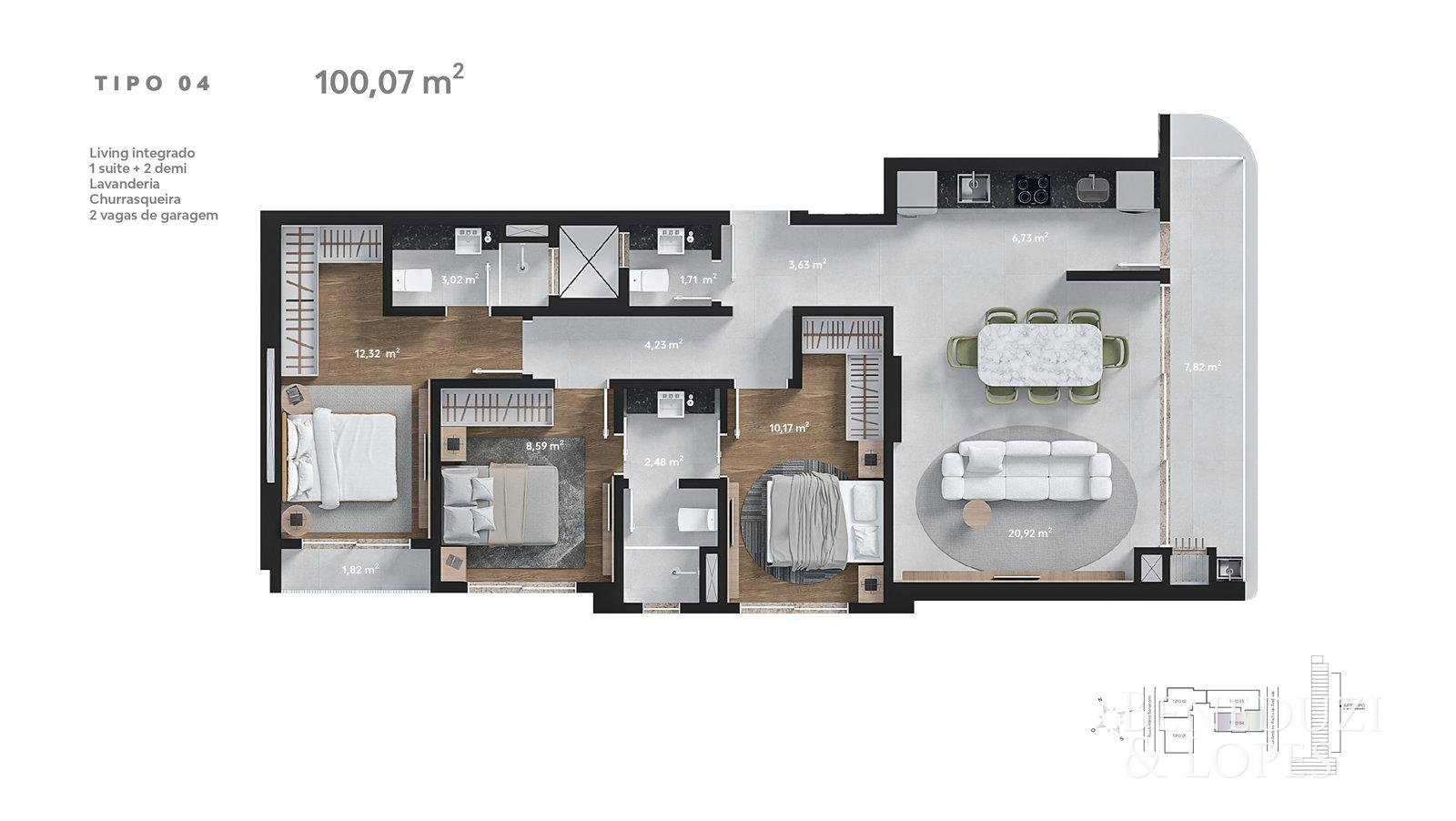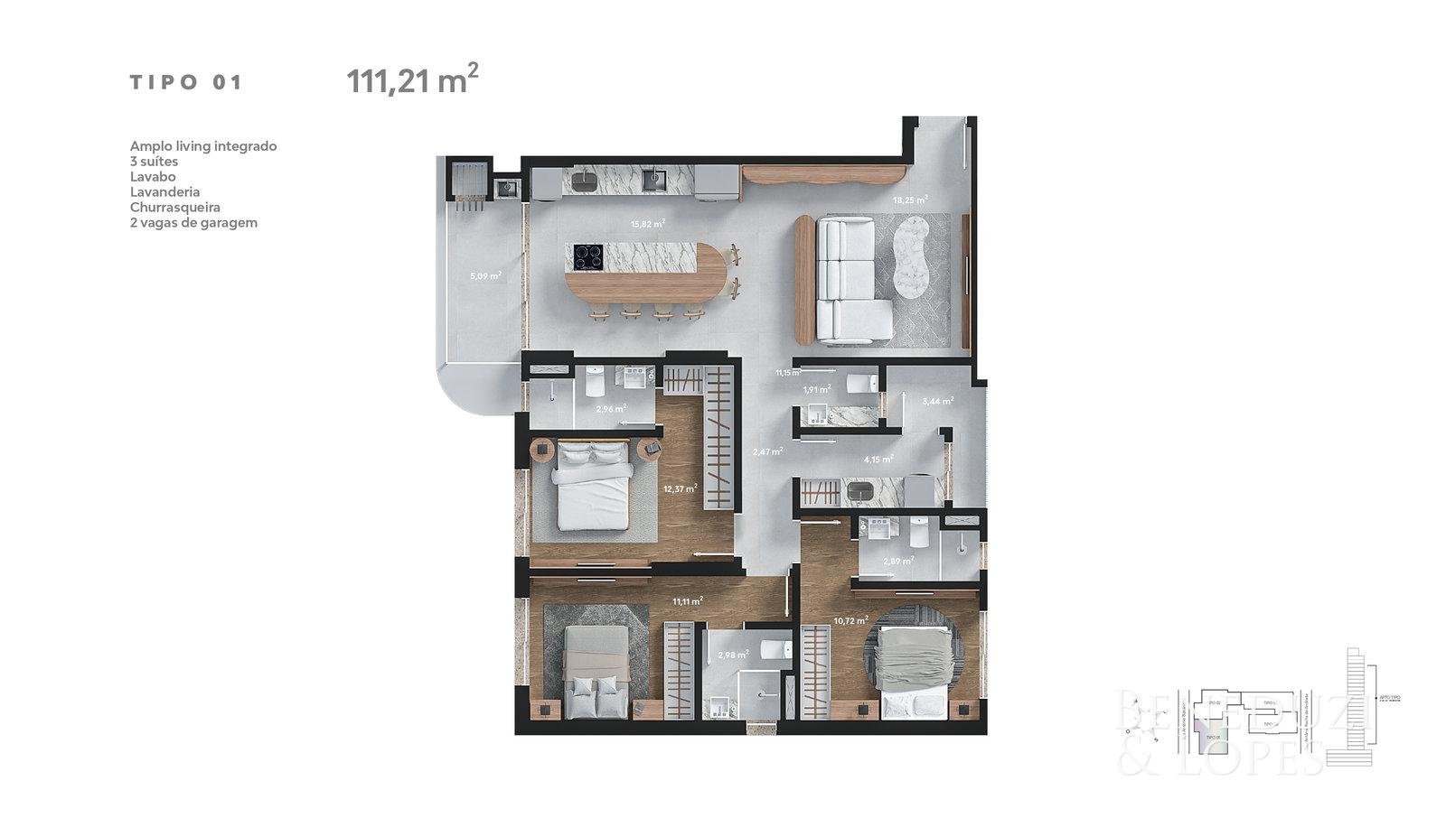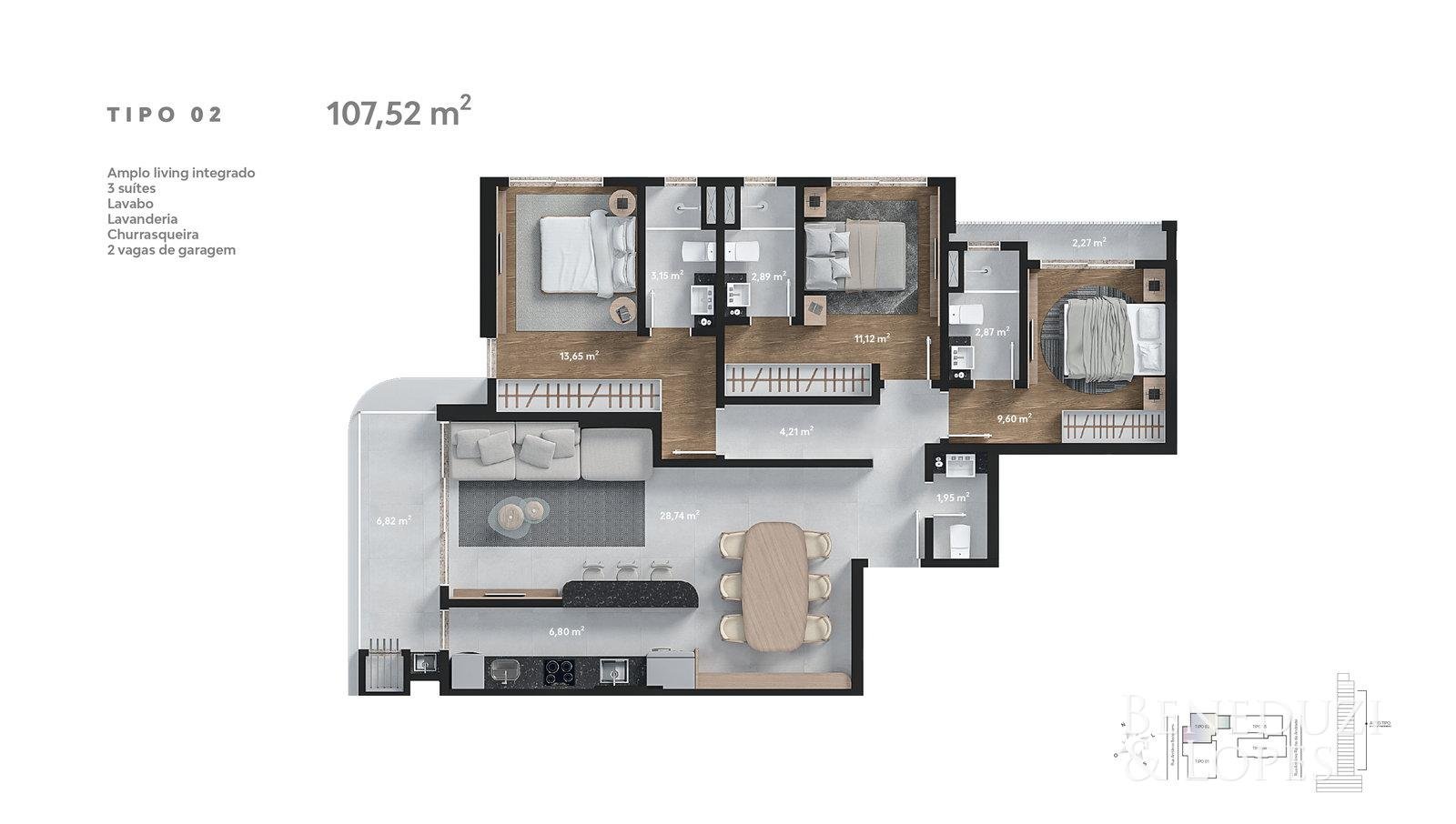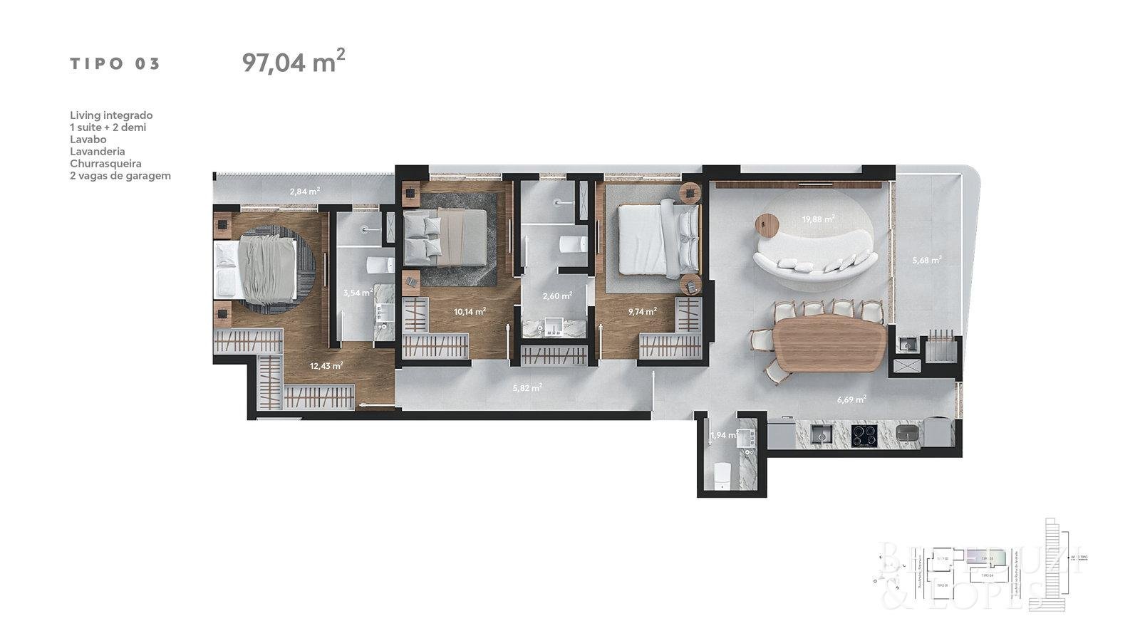 Apartamento com 01 suíte + 02 dormitórios, oferecendo uma planta funcional e bem distribuída. Conta com living integrado, sala de estar, cozinha e lavabo, proporcionando conforto no dia a dia.