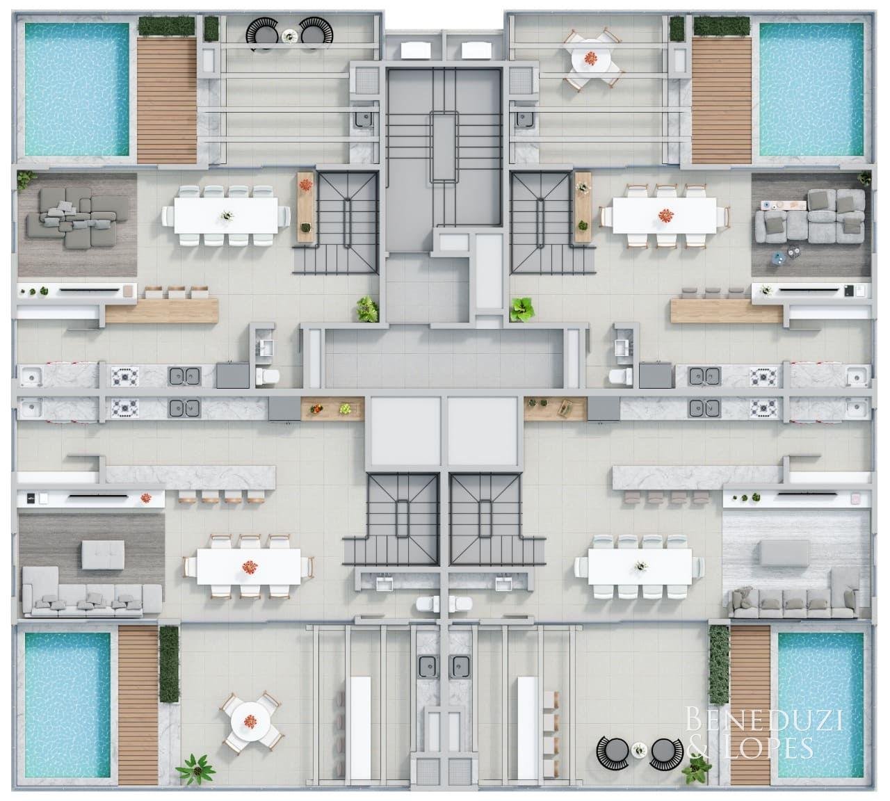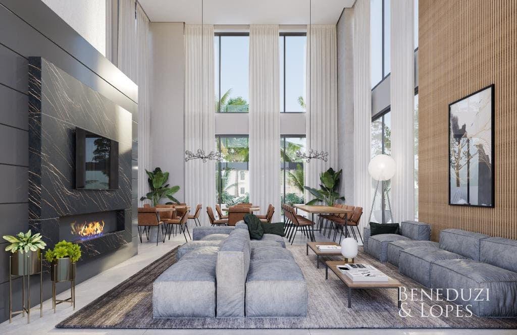 A unidade dispõe de espera para split, porcelanato nas áreas sociais e piso vinílico nos quartos, além de diferenciais como manta de redução de ruídos nos pisos, portas e rodapés com acabamento laqueado e janelas dos quartos com persianas motorizadas, garantindo conforto, qualidade e sofisticação.