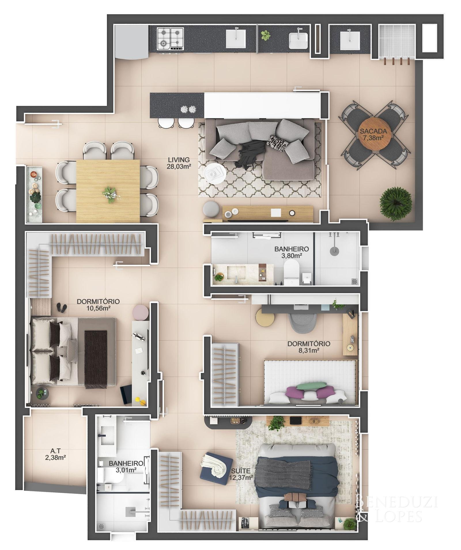 Apartamentos de 3 suítes, incluindo living, área de serviço, sacada,…