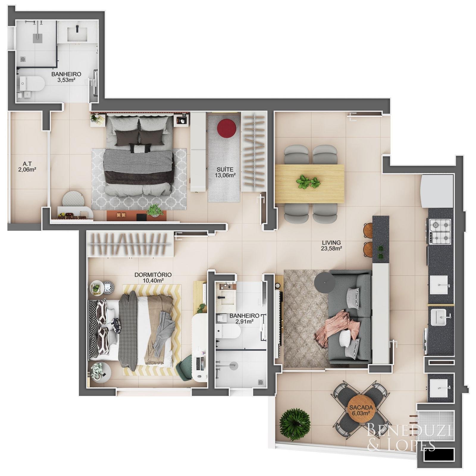 Apartamento com living integrado, proporcionando ambientes bem distribuídos e funcionais. Conta com sacada e varanda com churrasqueira a carvão, ideal para momentos de convivência. A unidade possui infraestrutura para água quente, infraestrutura para split, acabamento e rebaixo em gesso, além de porcelanato 80×80, agregando sofisticação e conforto aos ambientes.