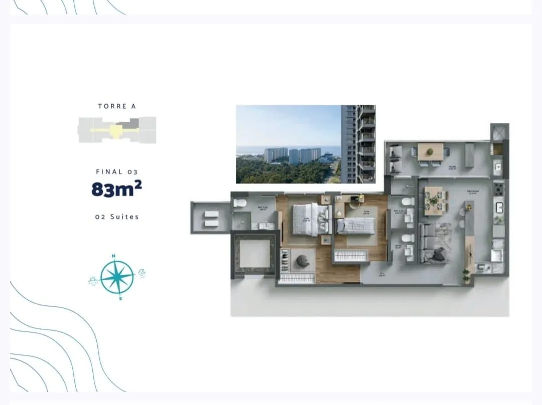 Apartamento de 02 suítes, living integrado com sala de estar, cozinha e área de serviço, além de 01 lavabo, com ambientes bem distribuídos e funcionais. Conta com vaga de garagem dupla e 83,50 m² de área privativa, oferecendo conforto e ótimo aproveitamento dos espaços.