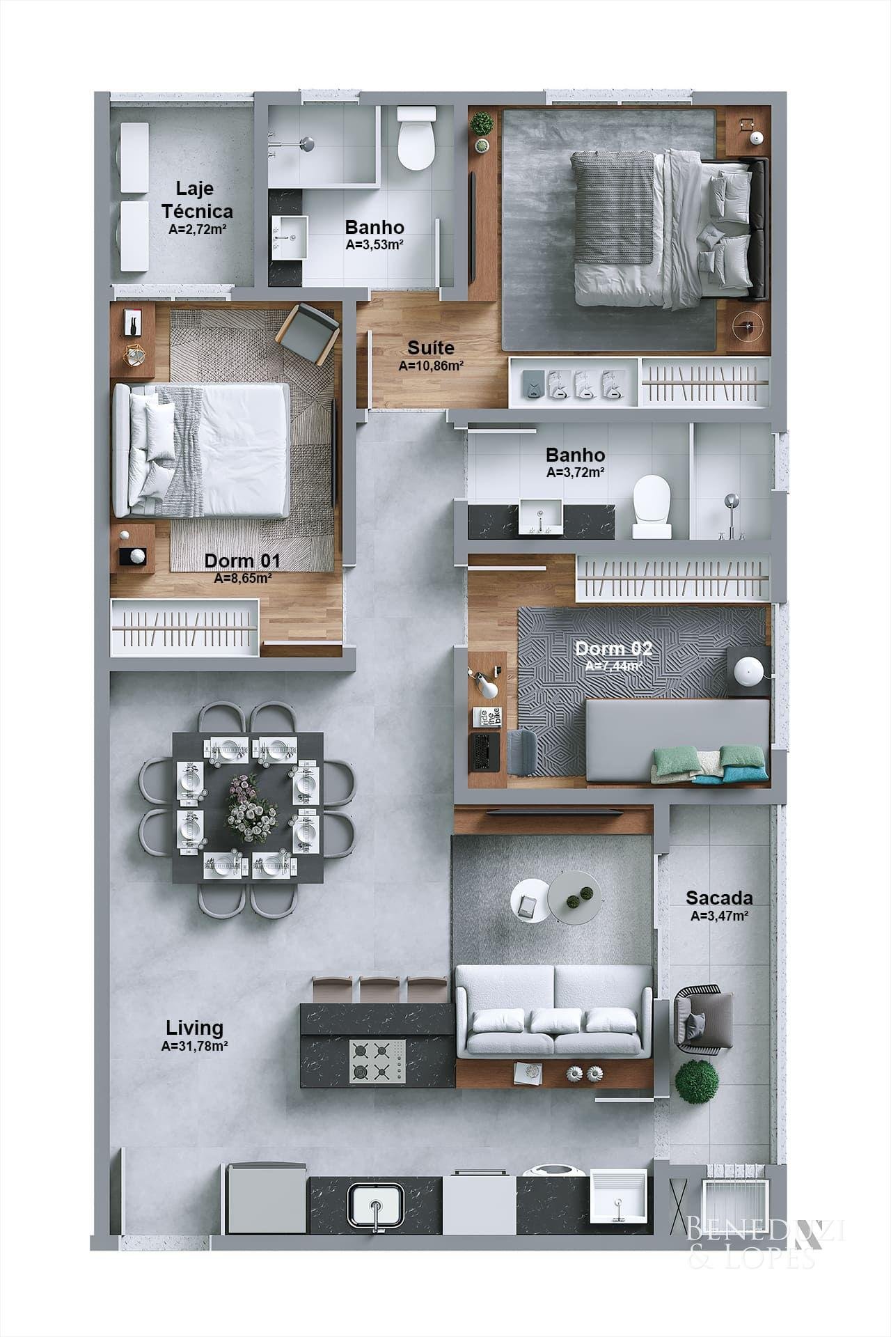 Apartamento com sala de estar, cozinha, área de serviço e sacada com churrasqueira a carvão, proporcionando ambientes bem distribuídos e ideais para o dia a dia. Conta ainda com excelente padrão construtivo, garantindo conforto e praticidade.