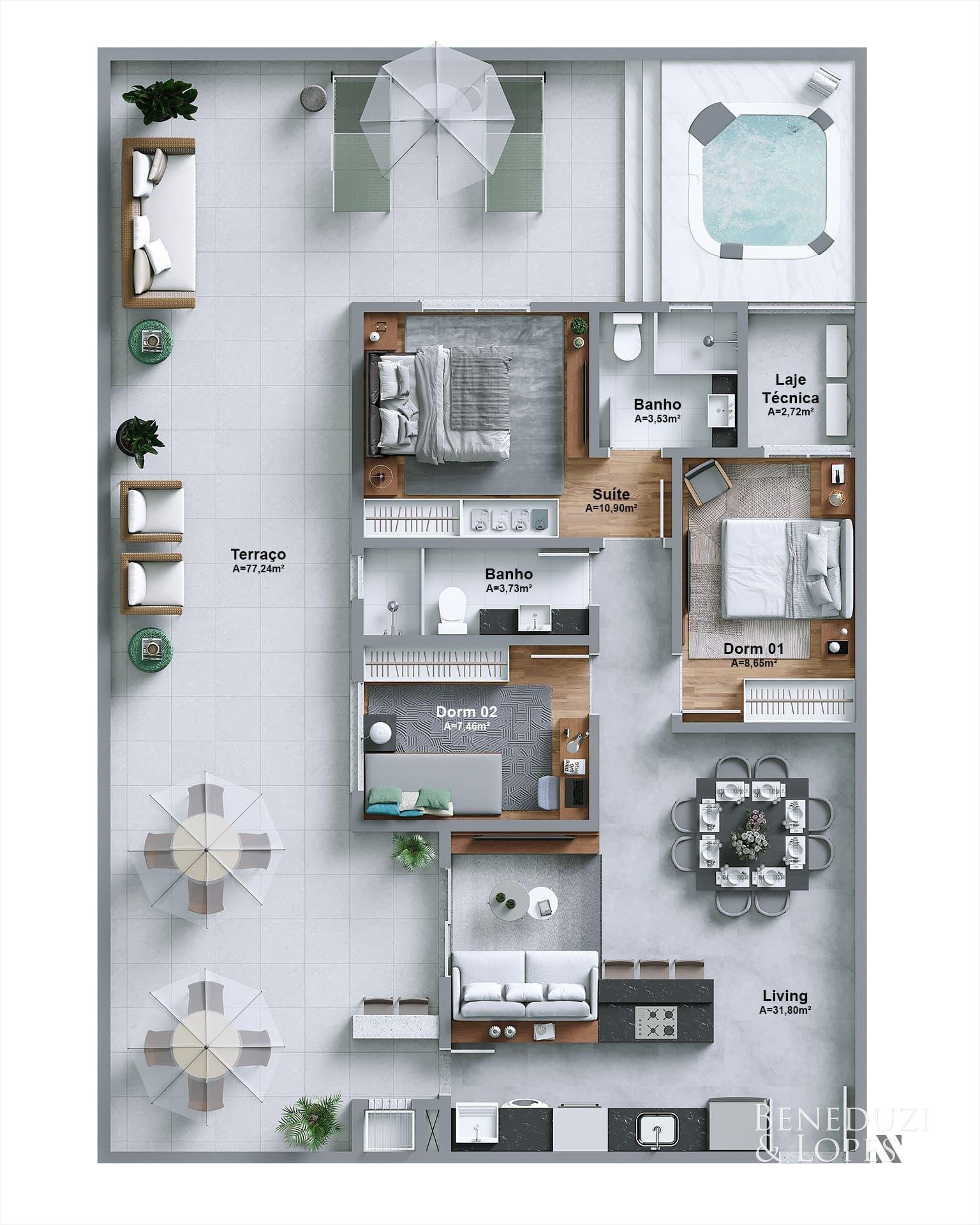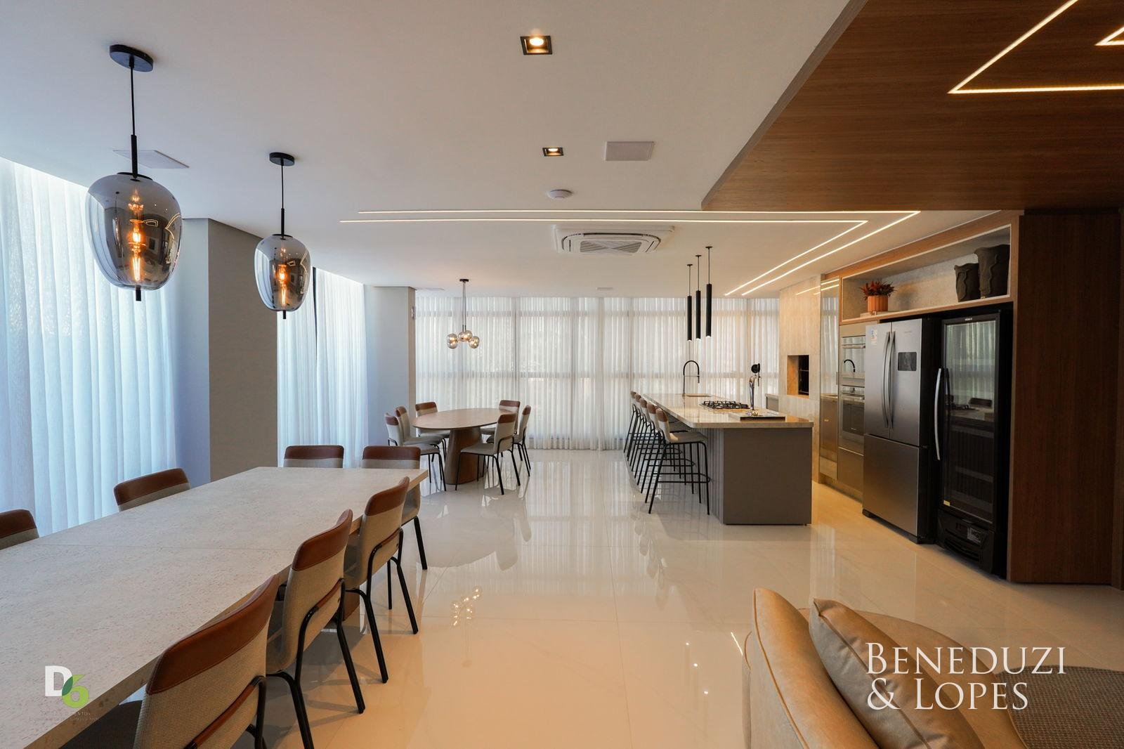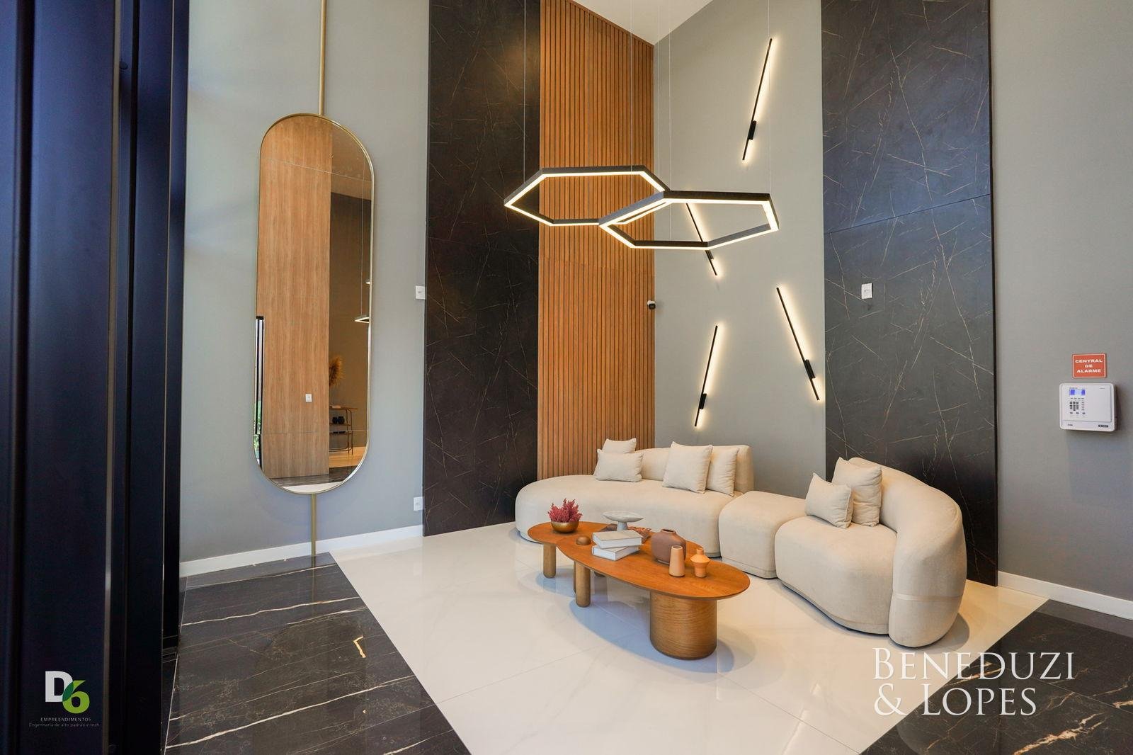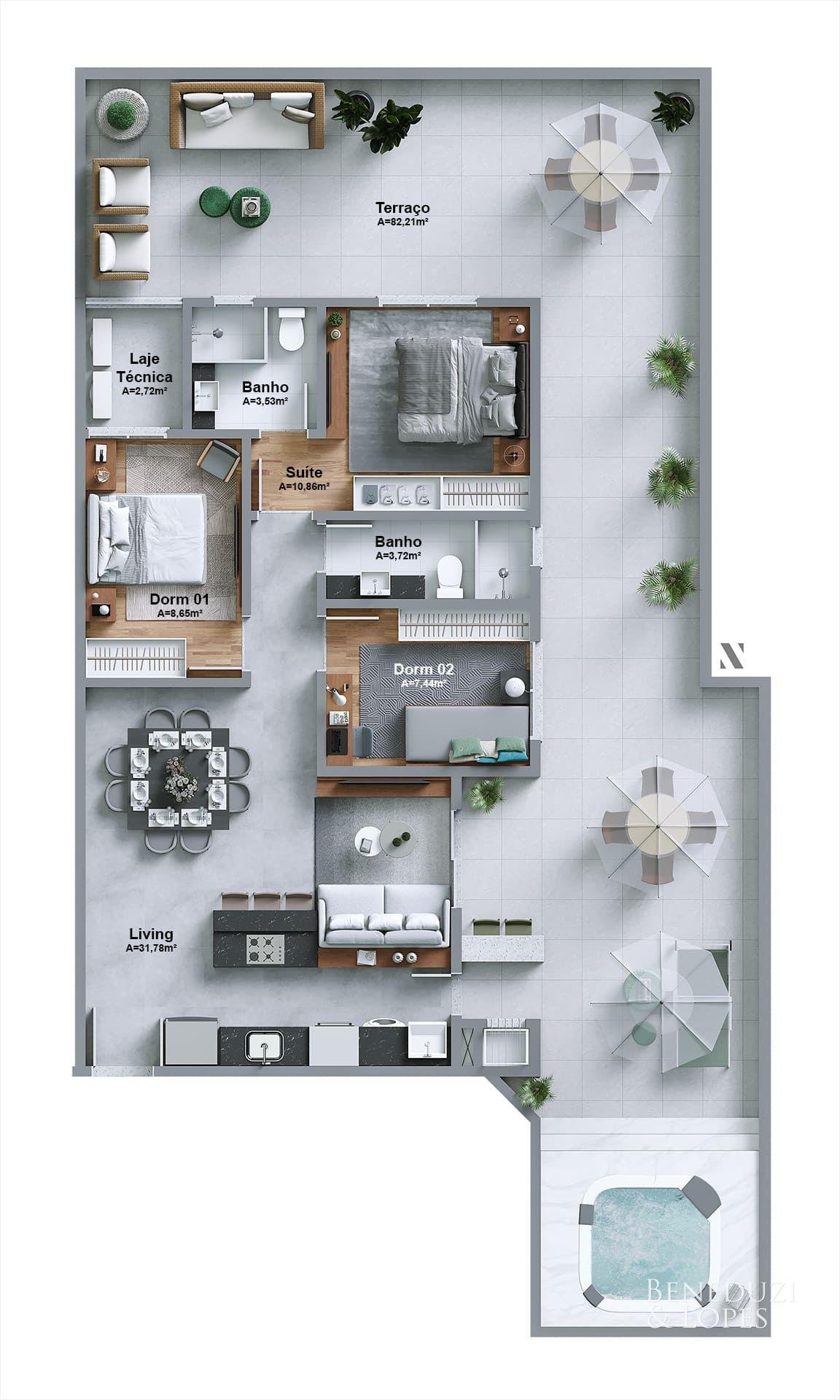 A unidade possui infraestrutura para água quente, espera para ar-condicionado tipo split em todos os ambientes, acabamento em gesso, além de piso porcelanato no living e cozinha e piso vinílico nos dormitórios. Dispõe também de infraestrutura para TV, telefone e internet, circuito interno de TV, tubulação para água quente e fria, puxadores diferenciados e vaso sanitário monobloco, reforçando o padrão de qualidade do imóvel.
