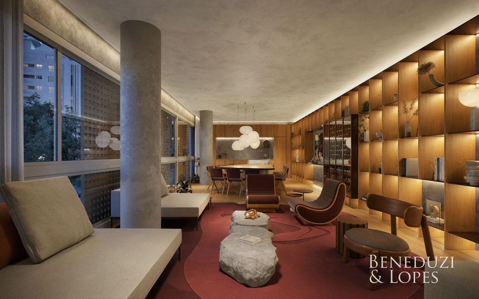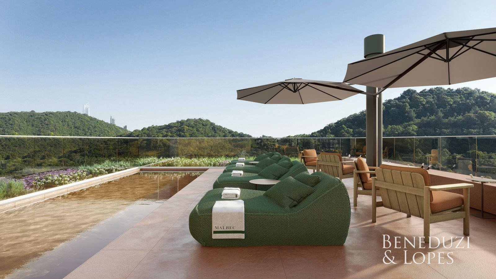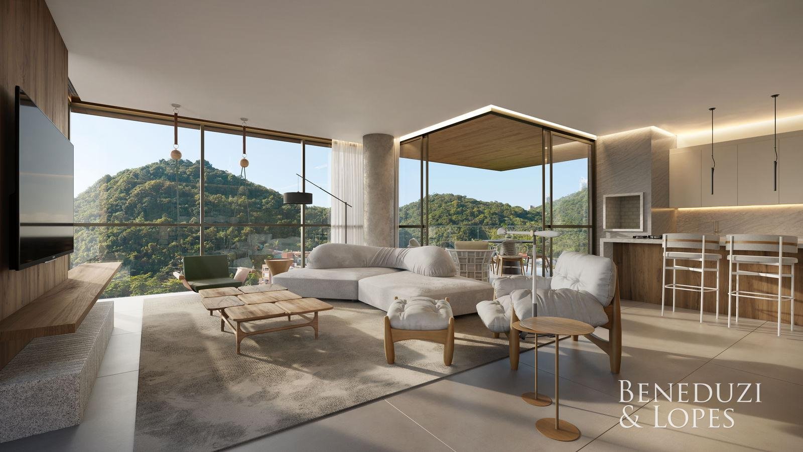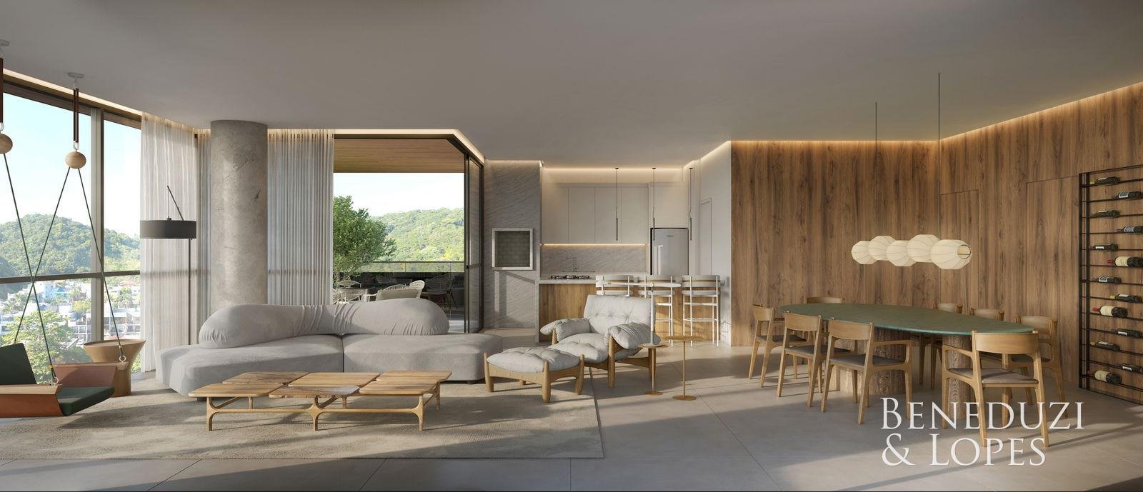 Apartamento com living integrado, lavabo e área de serviço, ambientes funcionais e bem distribuídos. Possui sacada com churrasqueira, cozinha americana, sala de jantar, varanda e vista panorâmica, além de acabamentos como porcelanato, gesso, piso aquecido nos banheiros e infraestrutura para água quente. Conta ainda com fechadura eletrônica, espera para split e medidores individuais.
