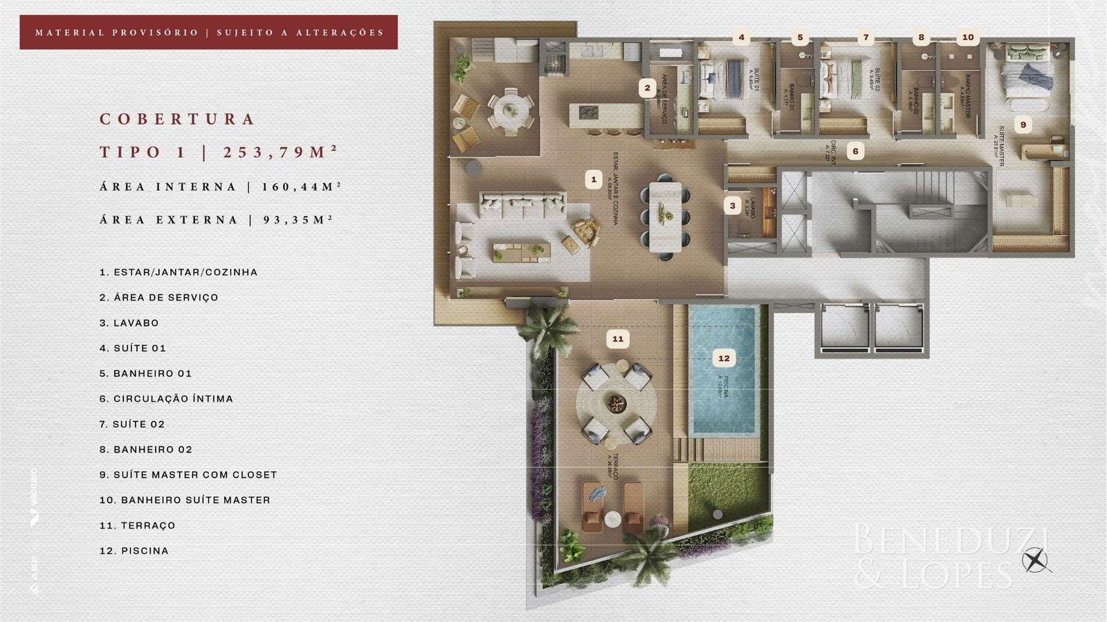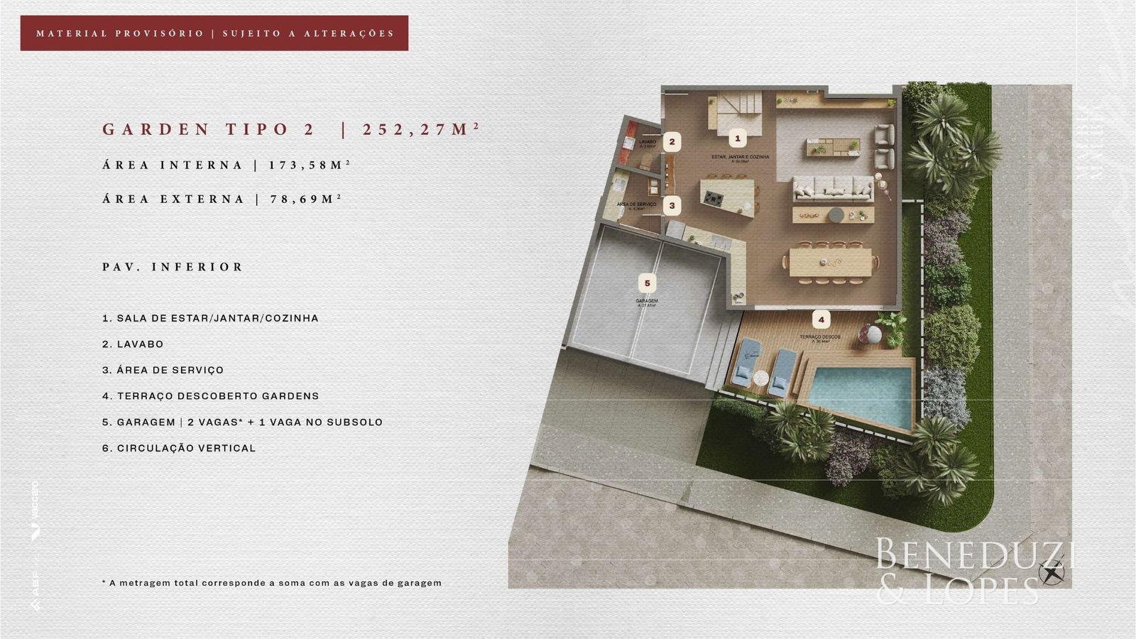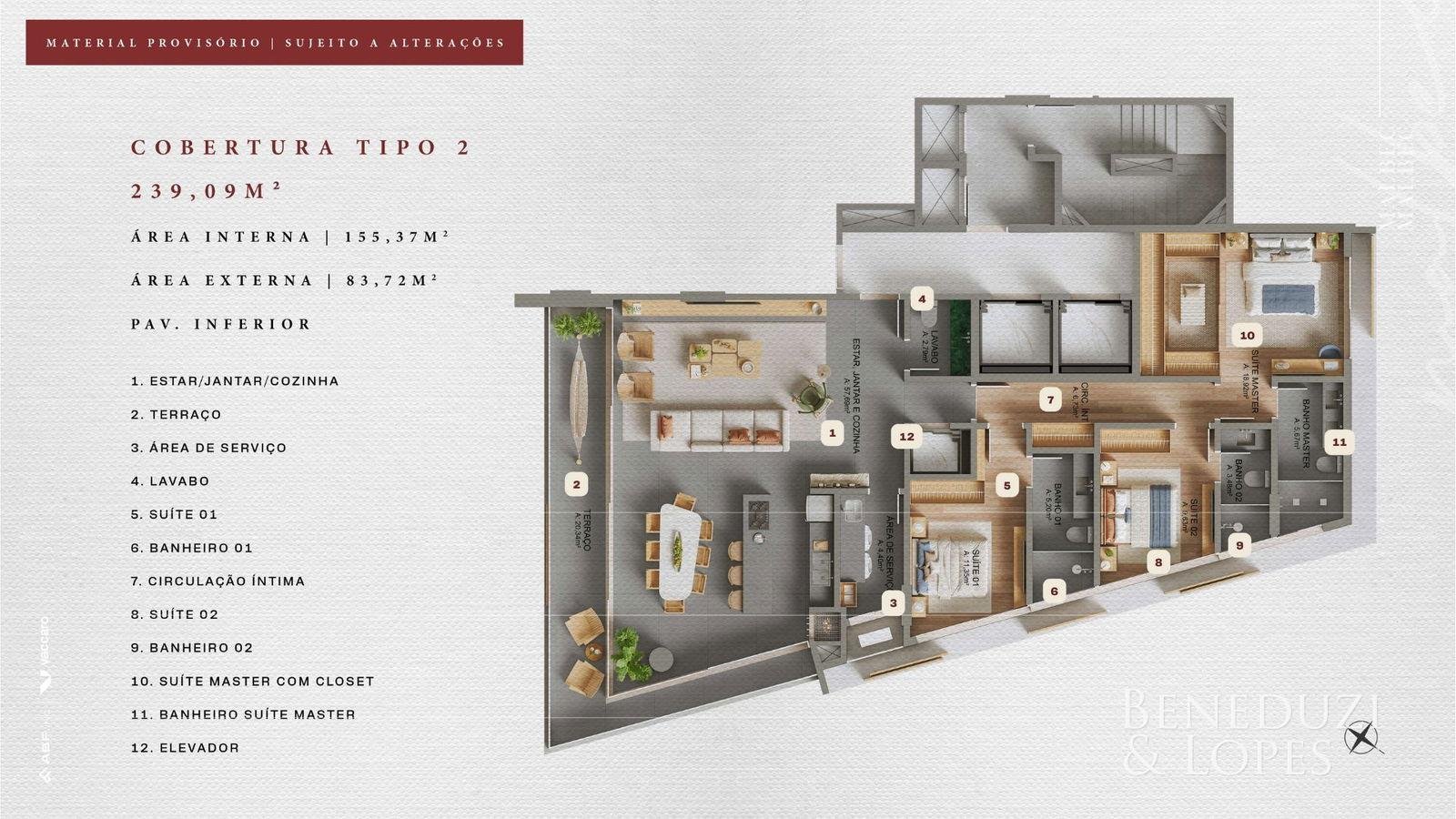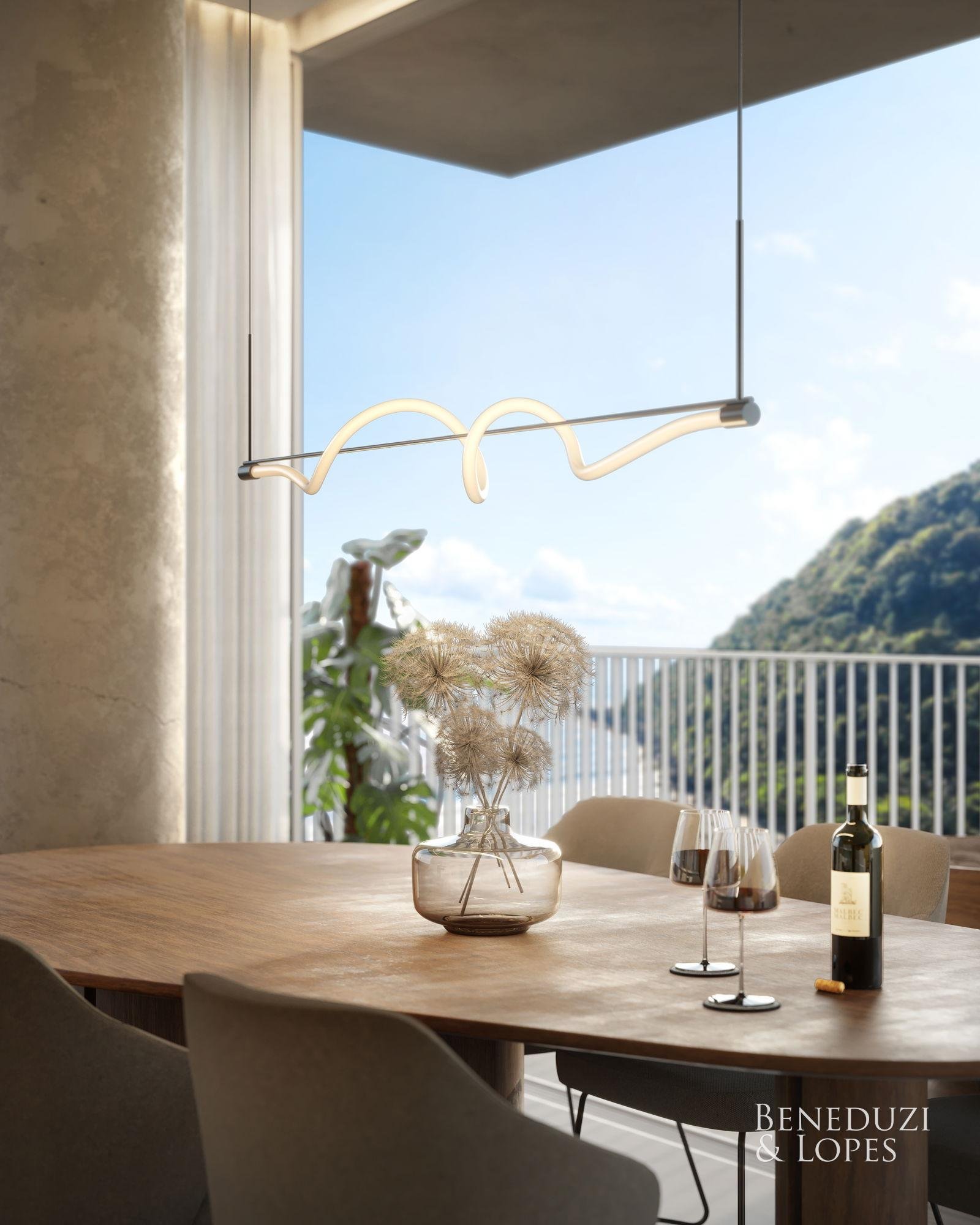 Apartamento com living integrado, lavabo e área de serviço, ambientes funcionais e bem distribuídos. Possui sacada com churrasqueira, cozinha americana, sala de jantar, varanda e vista panorâmica, além de acabamentos como porcelanato, gesso, piso aquecido nos banheiros e infraestrutura para água quente. Conta ainda com fechadura eletrônica, espera para split e medidores individuais.