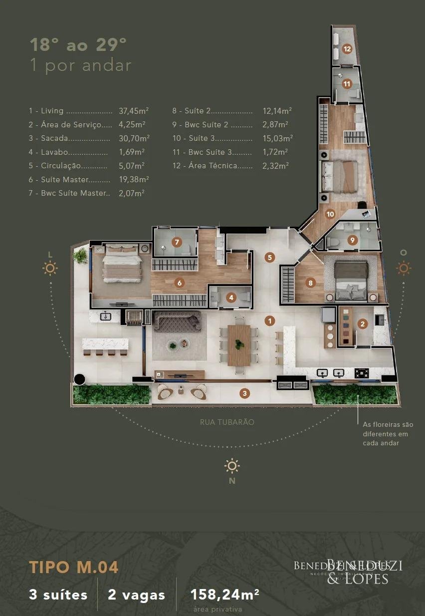 Apartamentos de 3 suítes, incluindo living, área de serviço, sacada, lavabo, e 2 vagas de garagem. Com 158,24m² de Área Privativa.