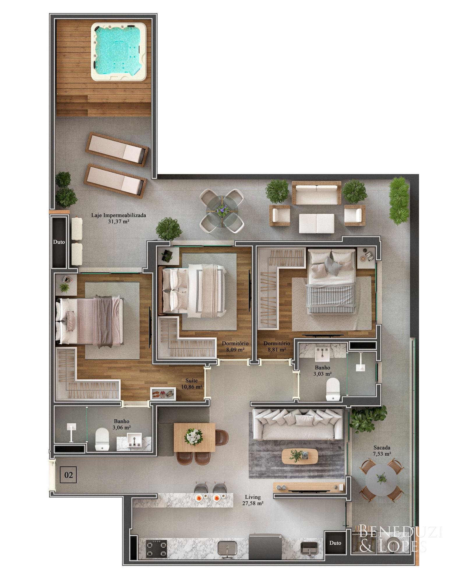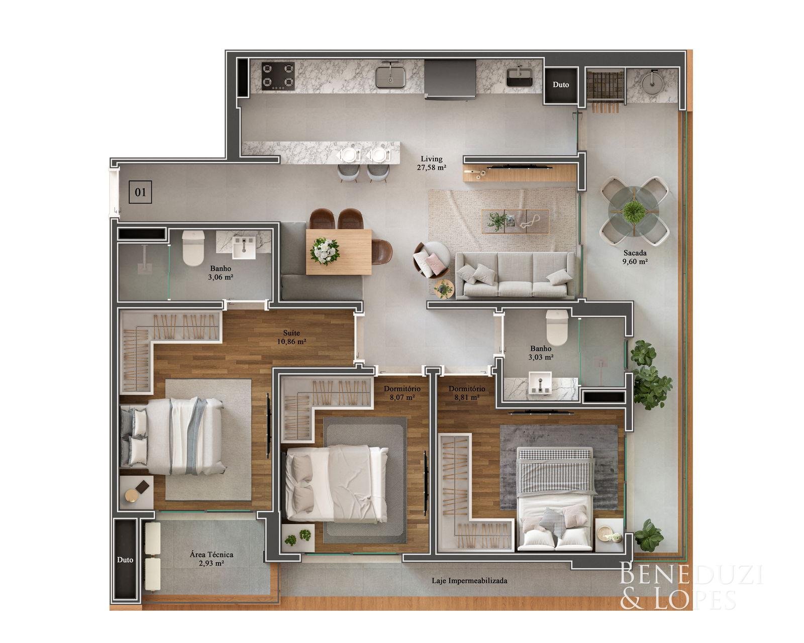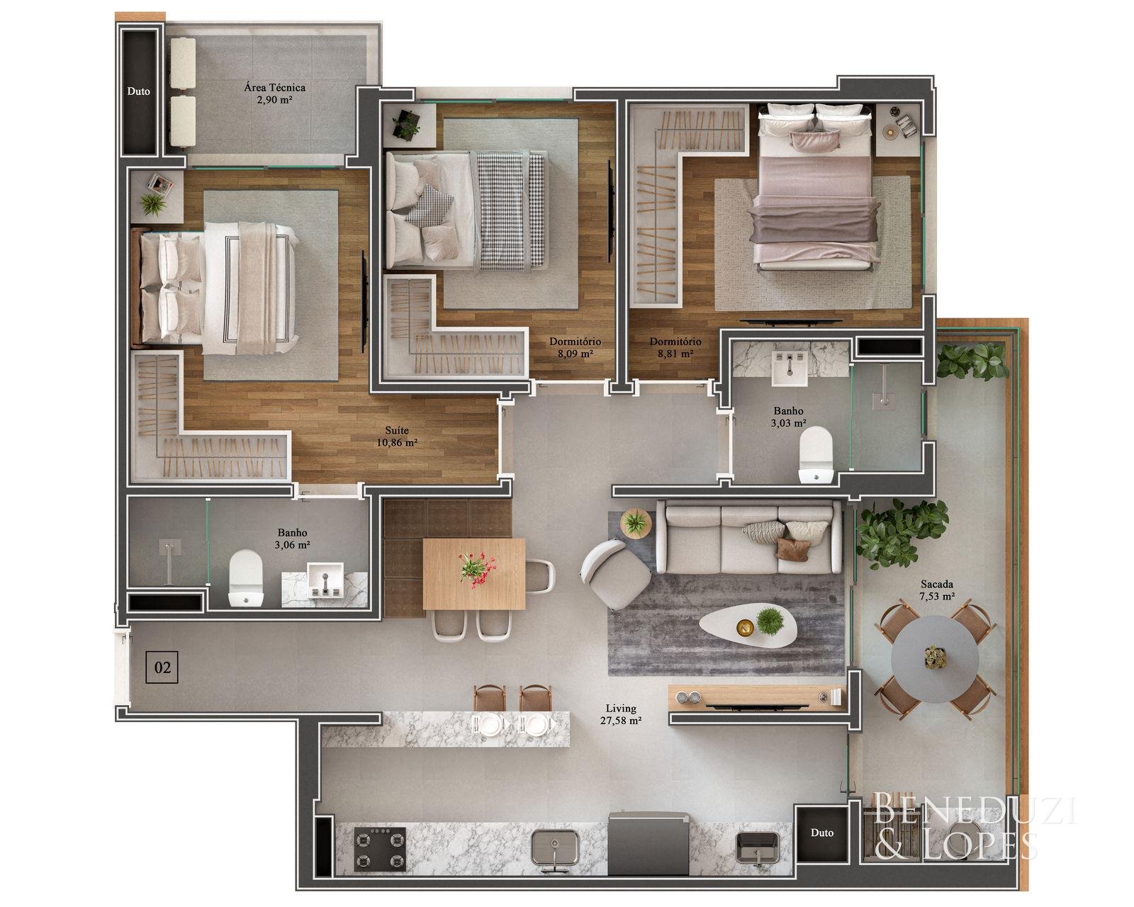Apartamentos com suíte + 02 dormitórios, suíte + 01 dormitório ou suíte + 01 dormitório + office, oferecendo plantas bem distribuídas e pensadas para diferentes perfis de moradores. As unidades contam com sacada com churrasqueira a carvão e pontos de água na sacada, proporcionando mais praticidade e conforto para momentos de convivência.
