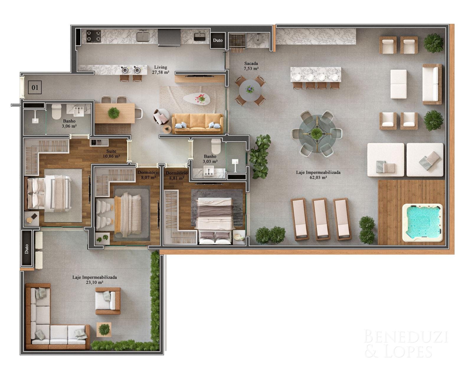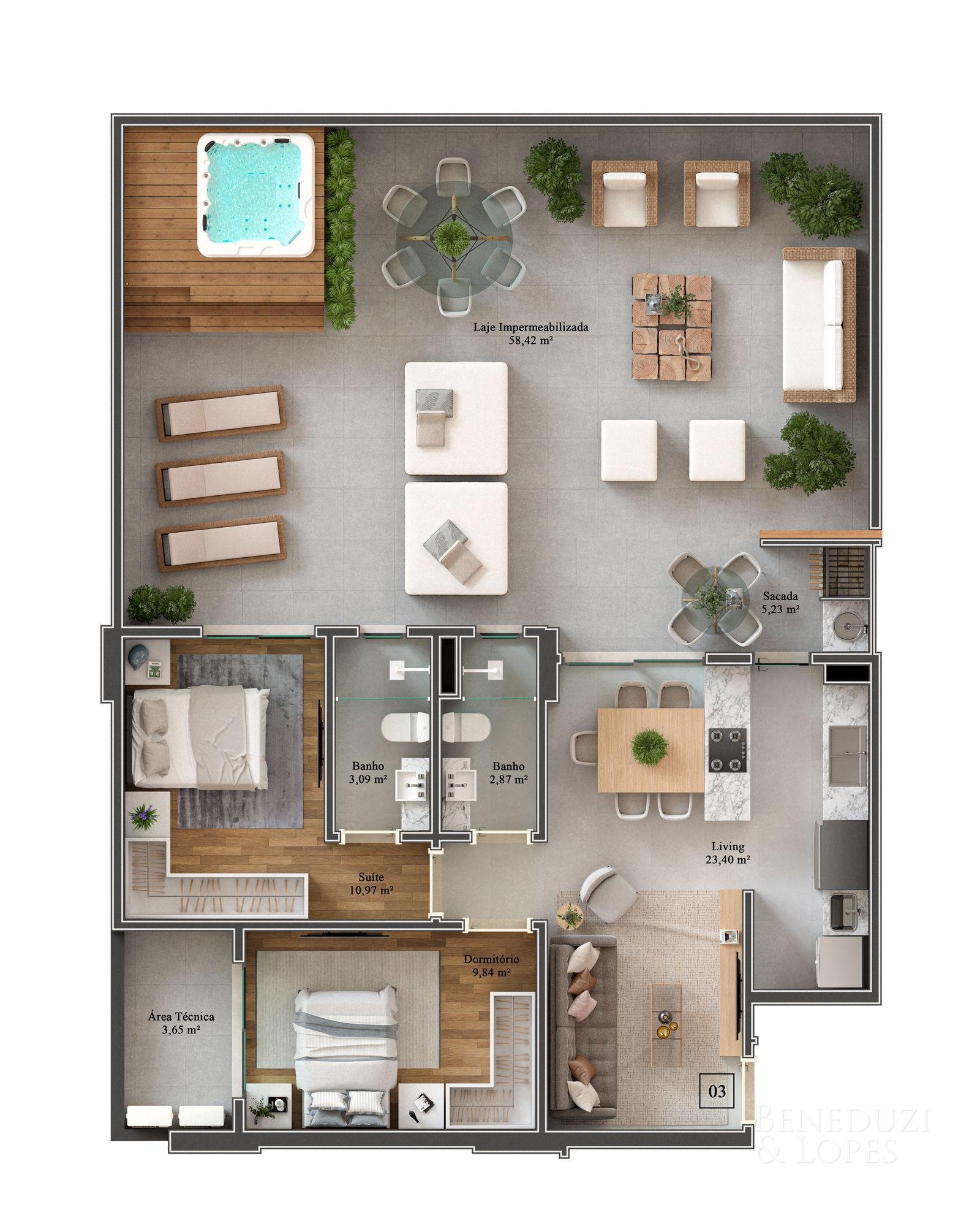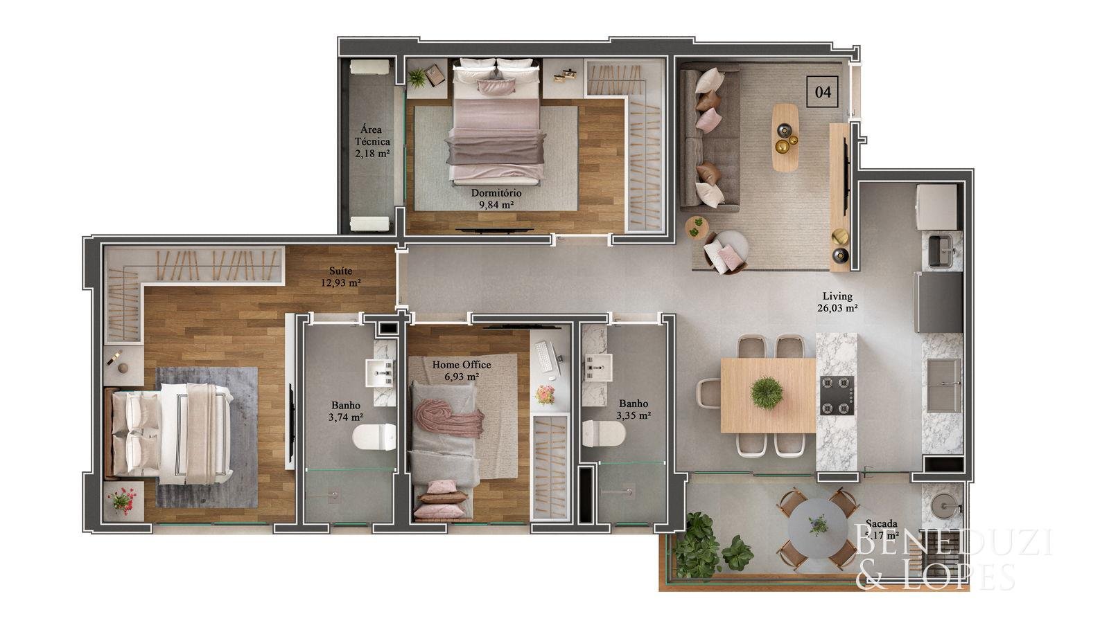 Apartamentos com suíte + 02 dormitórios, suíte + 01 dormitório ou suíte + 01 dormitório + office, oferecendo plantas bem distribuídas e pensadas para diferentes perfis de moradores. As unidades contam com sacada com churrasqueira a carvão e pontos de água na sacada, proporcionando mais praticidade e conforto para momentos de convivência.