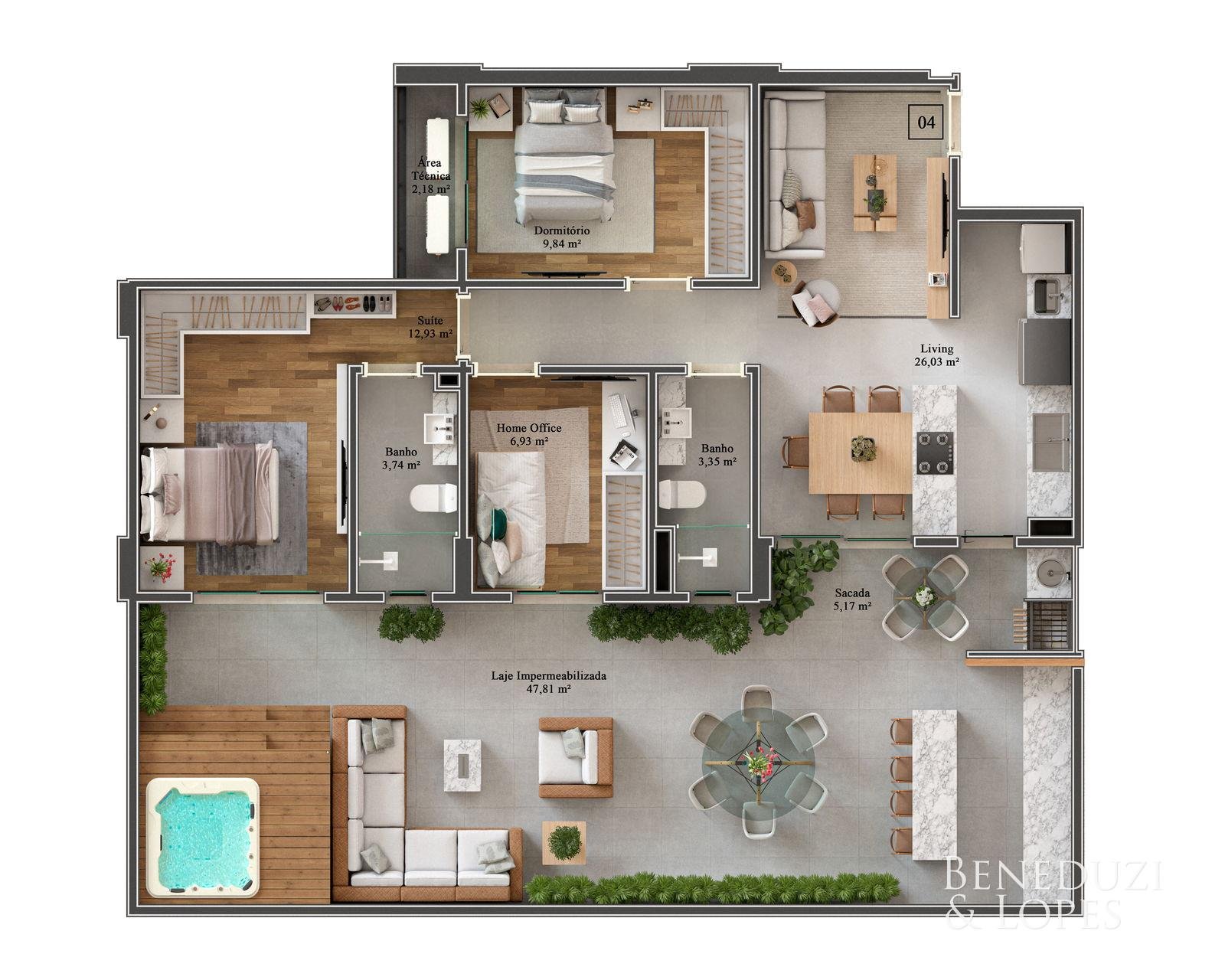Os imóveis possuem piso em porcelanato nas áreas sociais, laminado nos dormitórios, forro em gesso, nicho nos banheiros, além de infraestrutura para ar-condicionado. Contam também com medidores individuais, ponto para lava-louça, laje com isolamento acústico, aquecimento de água solar e home box individual, garantindo funcionalidade e eficiência no dia a dia.