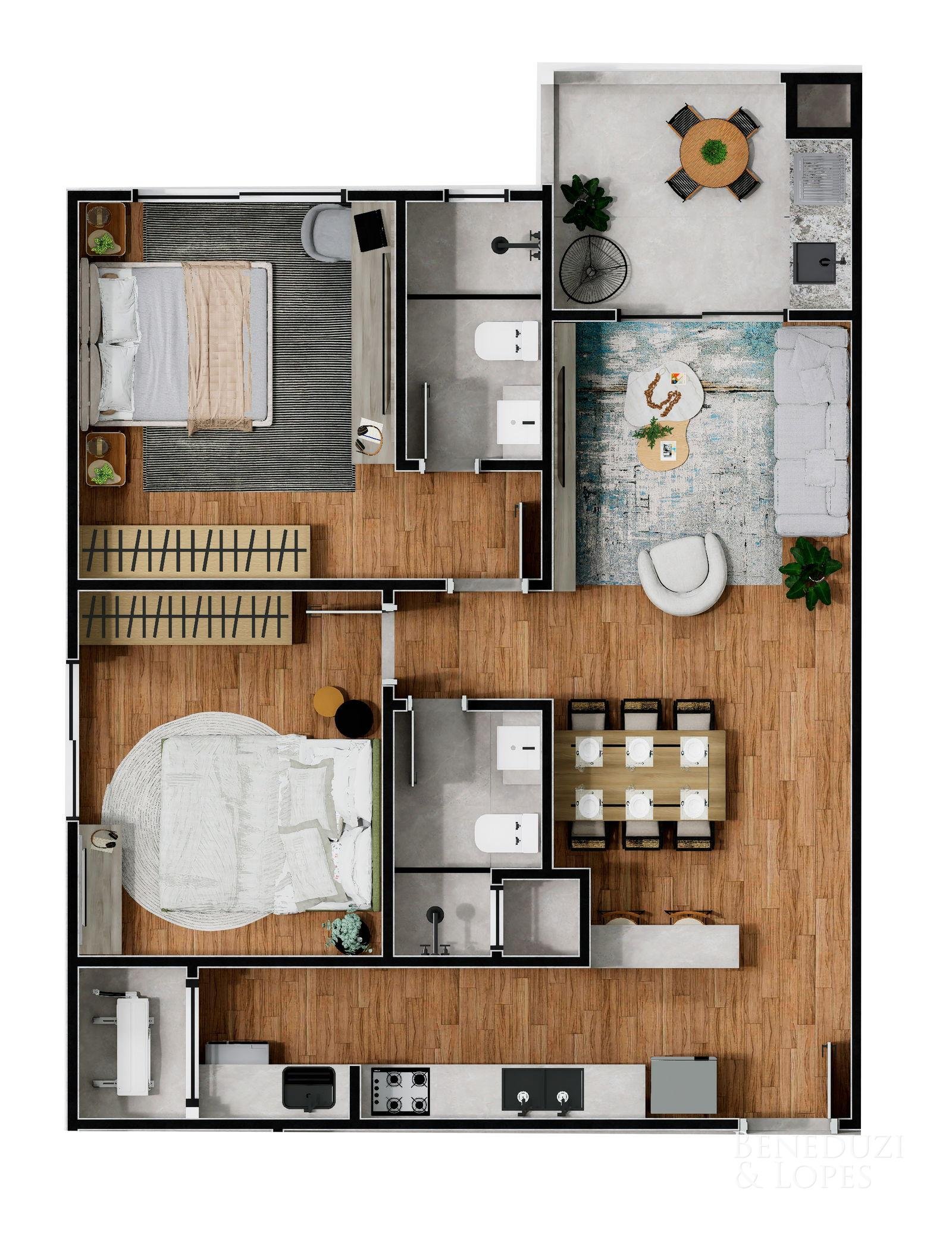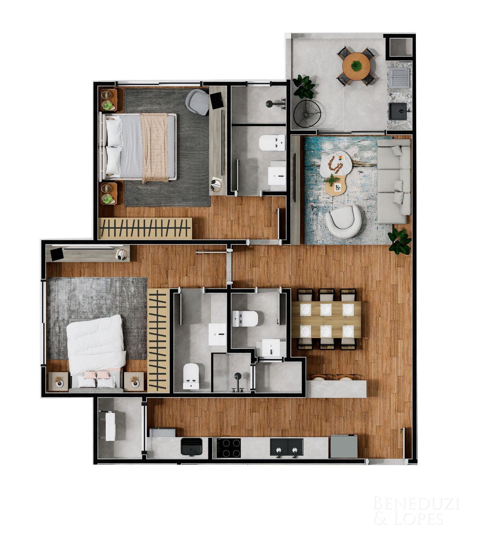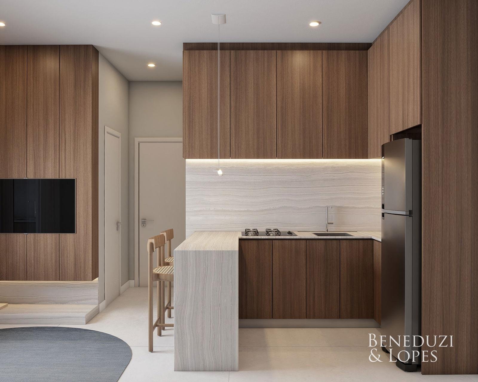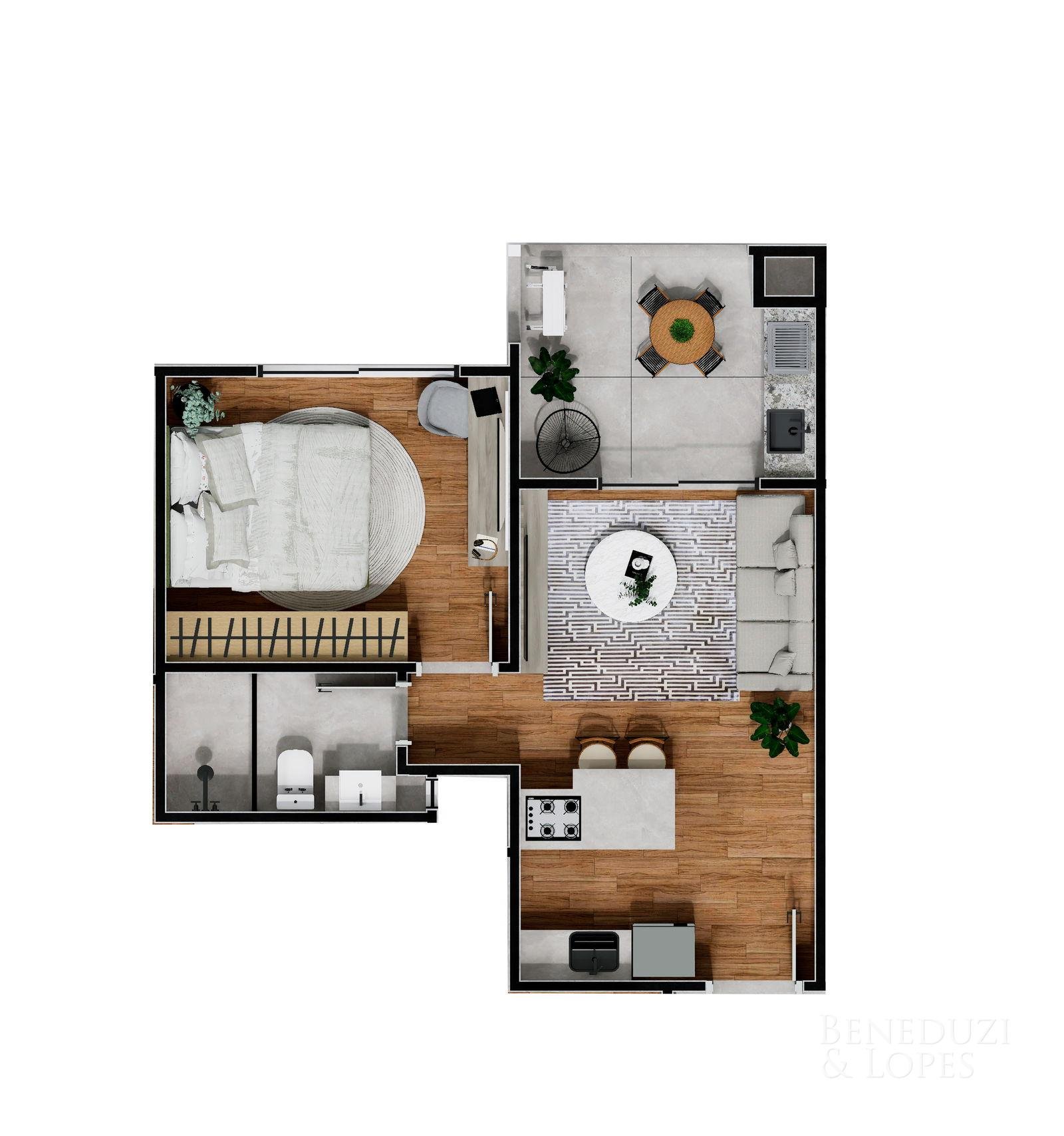 Loft com 02 suítes, oferecendo um conceito moderno e funcional, com living integrado, sala de estar e sala de jantar, além de cozinha americana que valoriza a integração dos ambientes. Conta com sacada e varanda gourmet com churrasqueira, ideal para momentos de lazer.