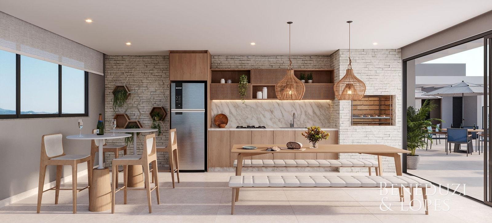 Infraestrutura para água quente Hidrômetro Individual Banheiro Social Gás Individual Espera para split Cozinha Americana Churrasqueira Área de Serviço Sala de jantar Sacada Sala de Estar Porcelanato Living Interfone Fechadura com senha na porta de entrada Cozinha Acabamento em gesso