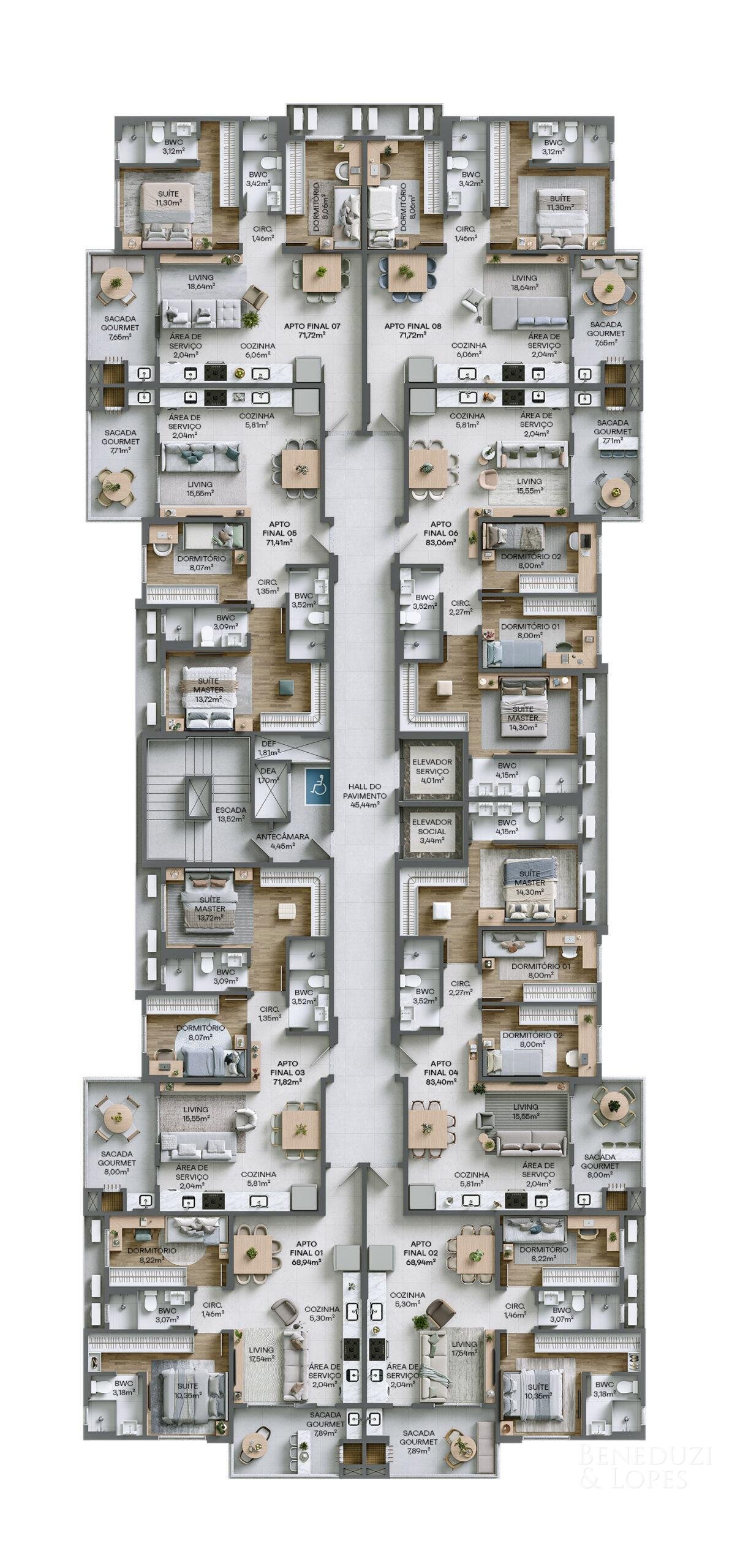 Hall de entrada decorado e mobiliado Medidores de água, luz e gás individuais Interfone Rooftop Salão de festas Sala de jogos Piscina infantil Piscina adulto Espaço gourmet Elevador Brinquedoteca Academia