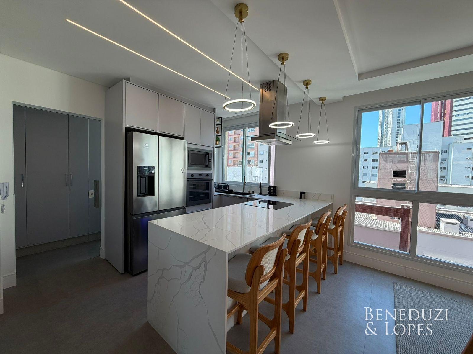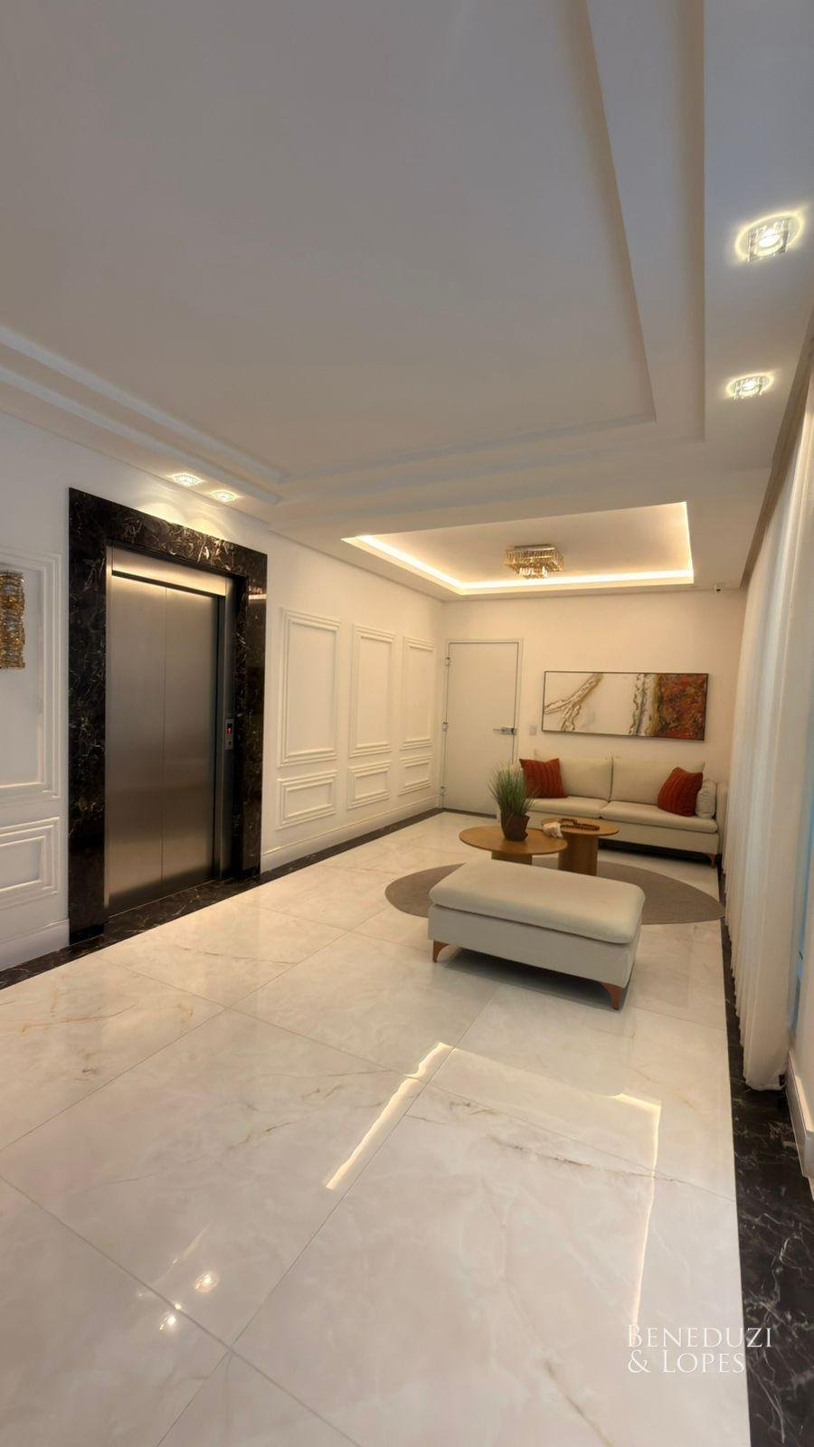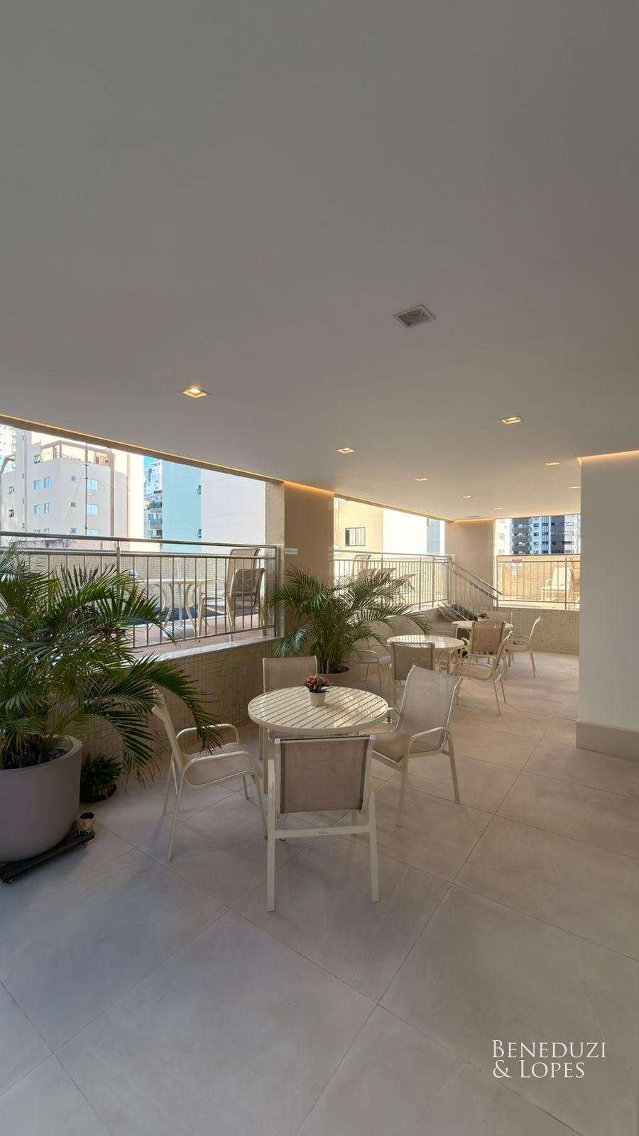 Apartamento com living integrado, sala de estar e cozinha americana, proporcionando ambientes amplos e bem distribuídos. Conta com lavabo, banheiro social, área de serviço e churrasqueira a carvão, ideal para momentos de lazer e convivência, além de vista panorâmica que valoriza o imóvel.