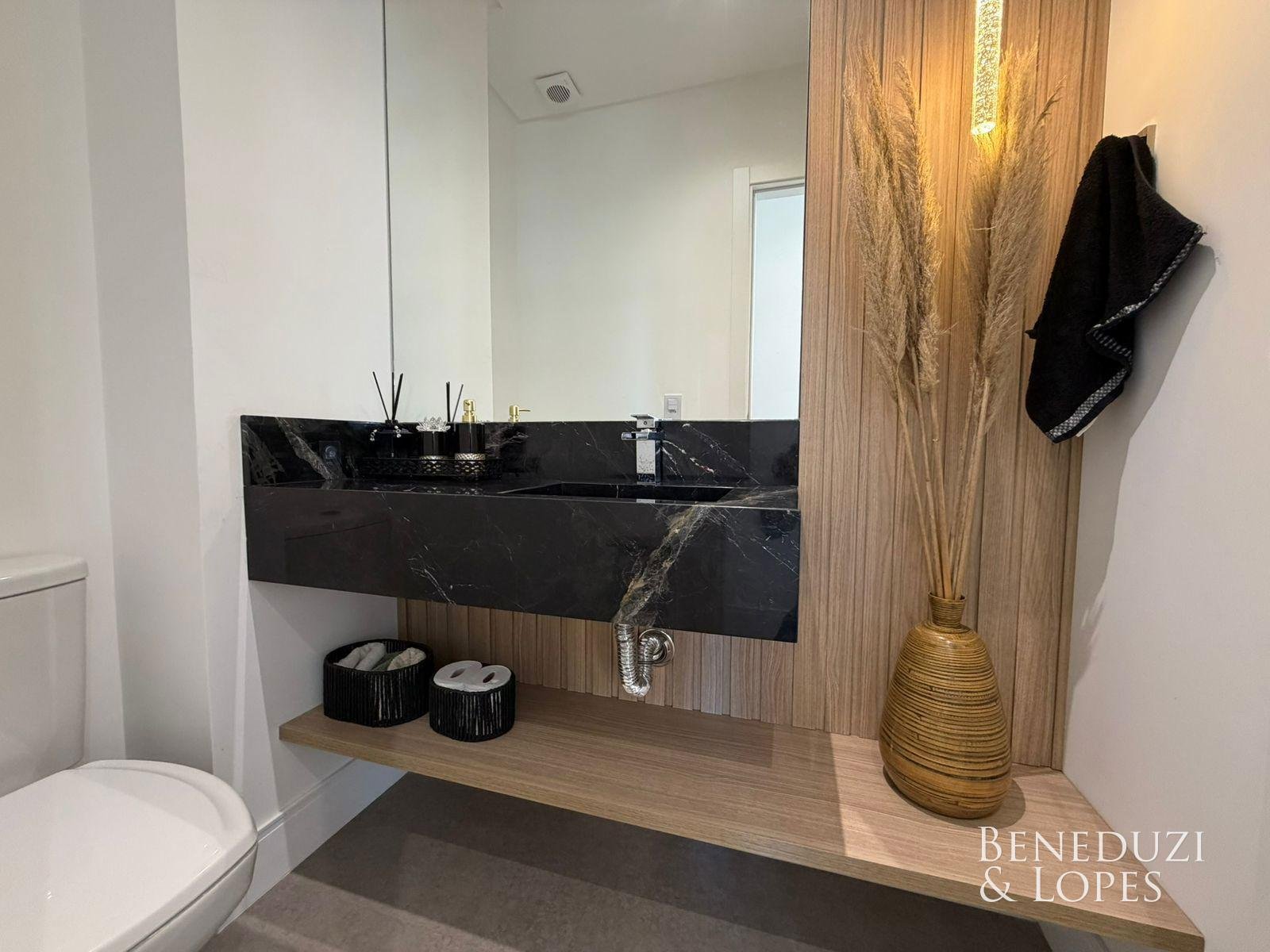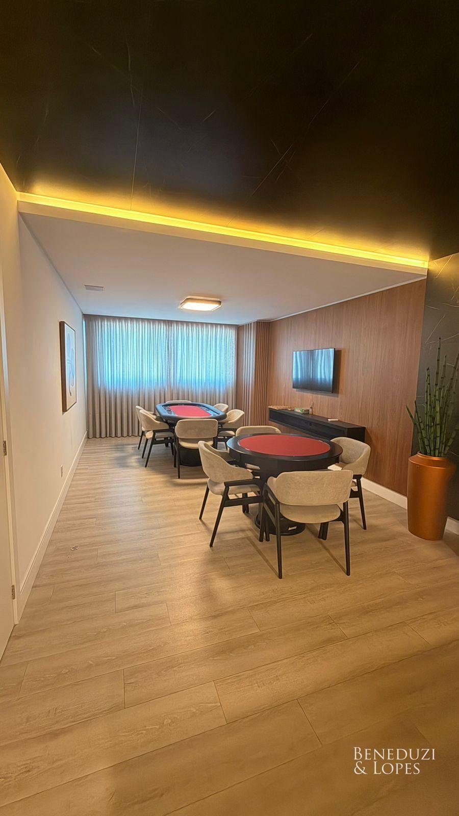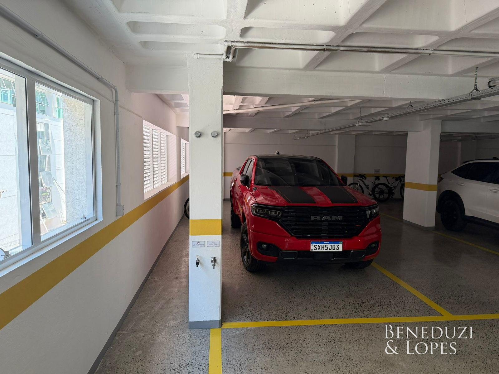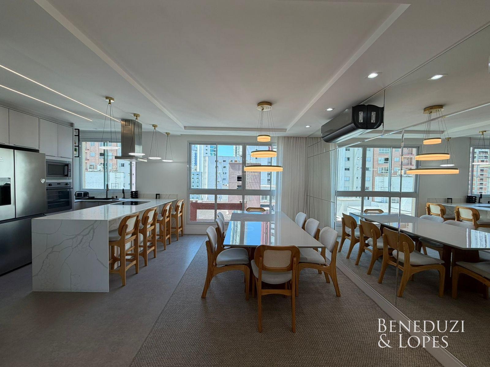 Apartamento com living integrado, sala de estar e cozinha americana, proporcionando ambientes amplos e bem distribuídos. Conta com lavabo, banheiro social, área de serviço e churrasqueira a carvão, ideal para momentos de lazer e convivência, além de vista panorâmica que valoriza o imóvel.